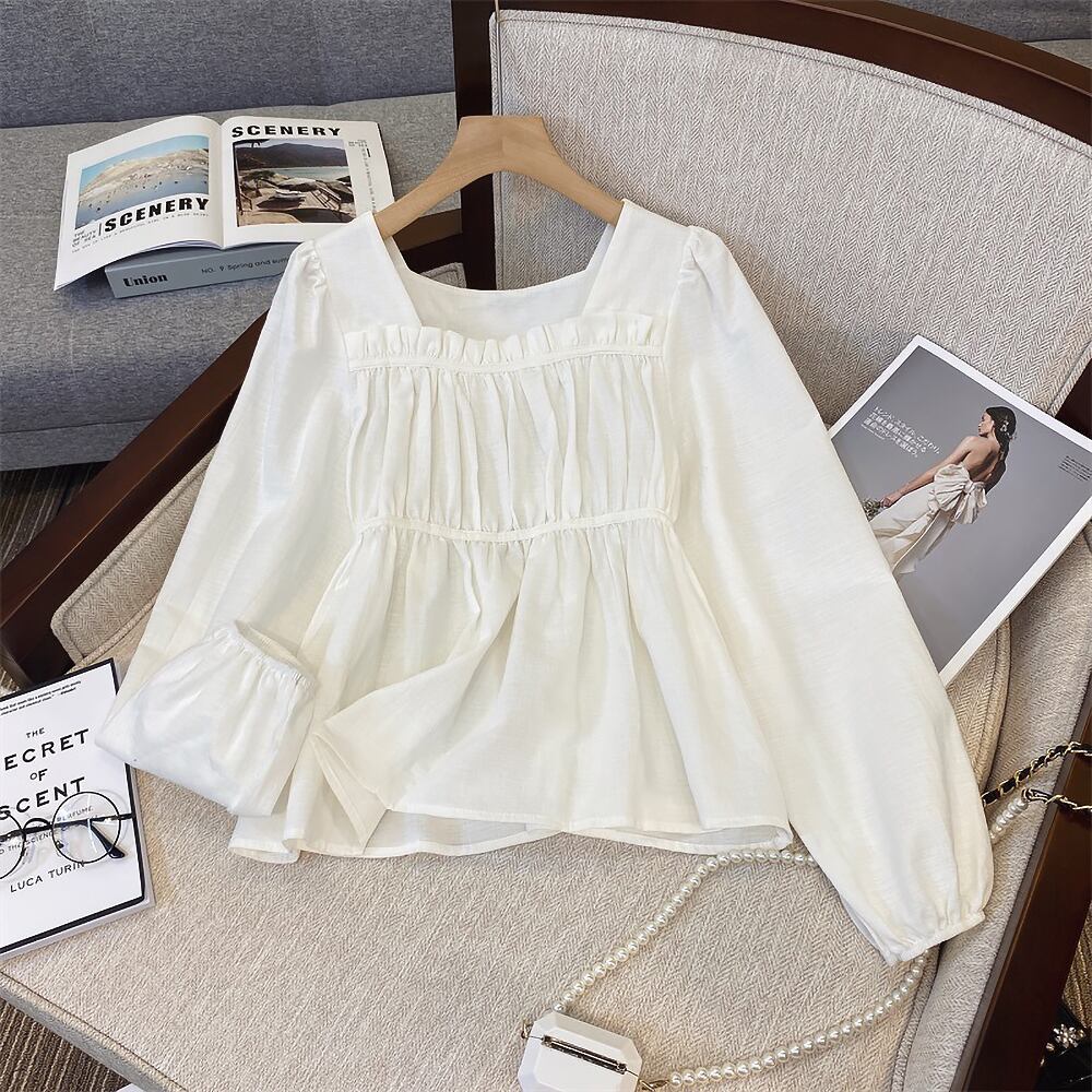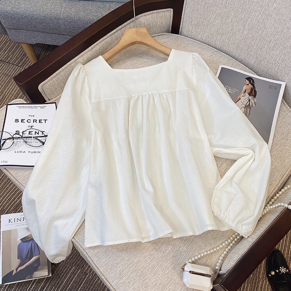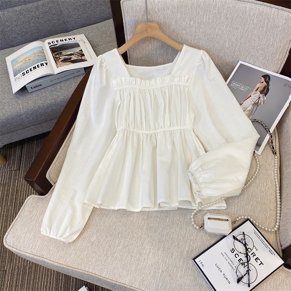 全2色 長袖 スクエアネックブラウス ハイウエスト フェミニン エレガント シンプル トップス 薄め シャツ ブラウス チュニック 白シャツ 白トップス 袖あり パフスリーブ 萌袖 スクエアネック 襟なし プリーツ フリル タック 大人可愛い きれいめ 大人 上品 おしゃれ お洒落 大人女子 ラフ ラブリー キュート ガーリー 無地 春 秋 レディース 女性用 OL 学生 お出かけ 女子会 休日 普段使い 若見え 大きいサイズ 白 ホワイト 黒 ブラック 韓国コーデ 韓国ファッション ラージサイズ
