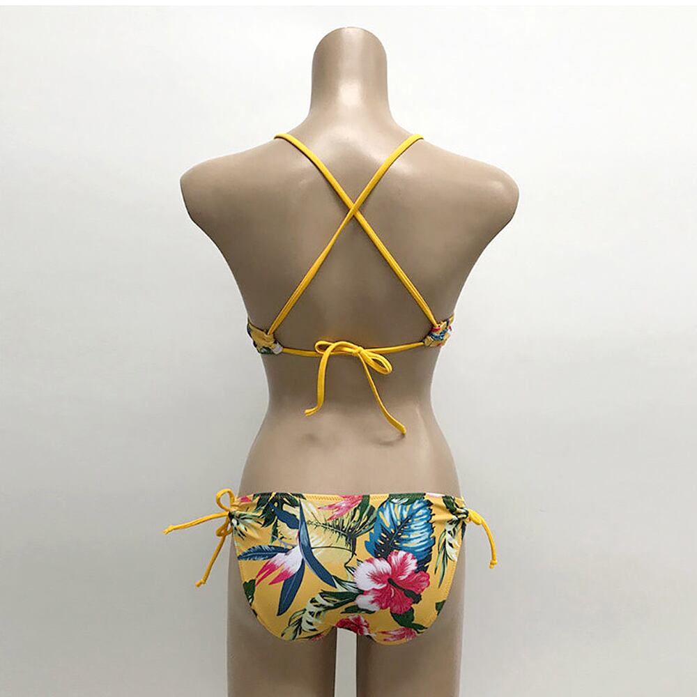 バカンスにぴったりのトロピカルプリントの紐ビキニです。