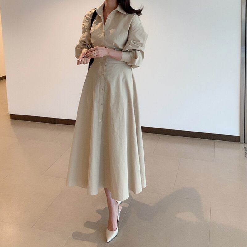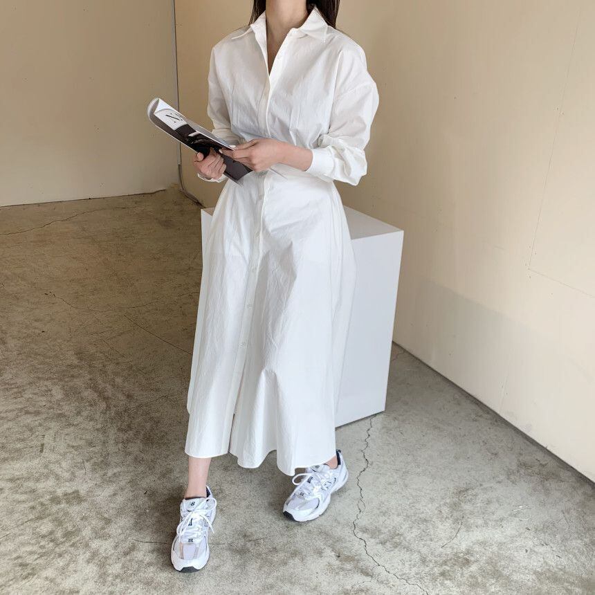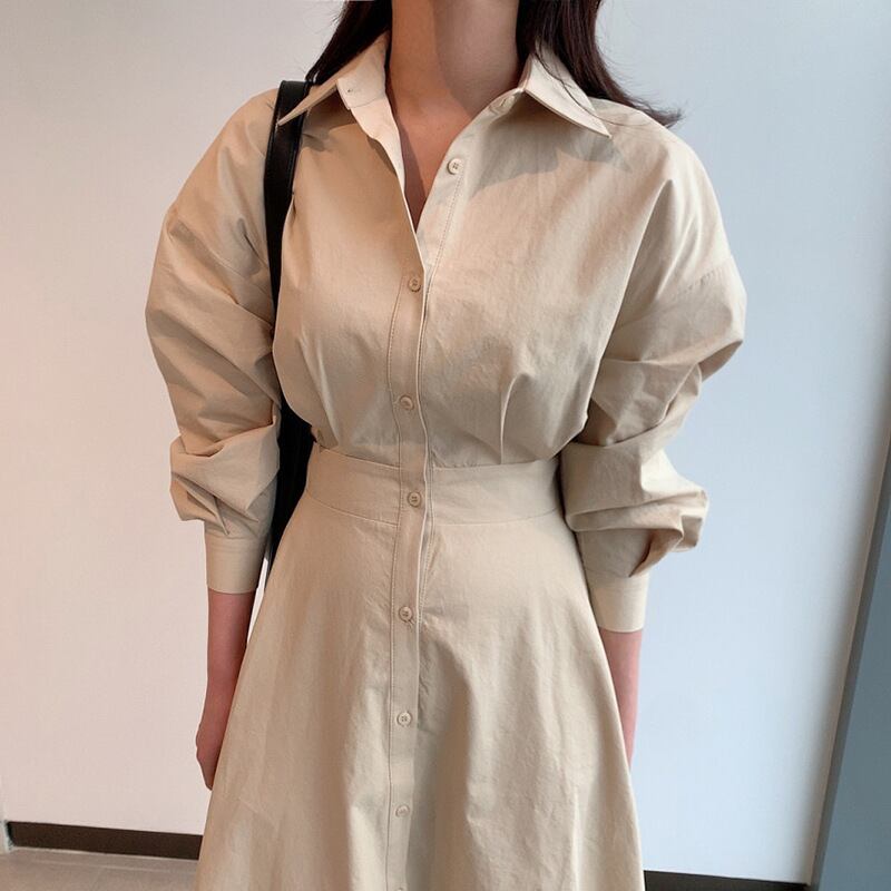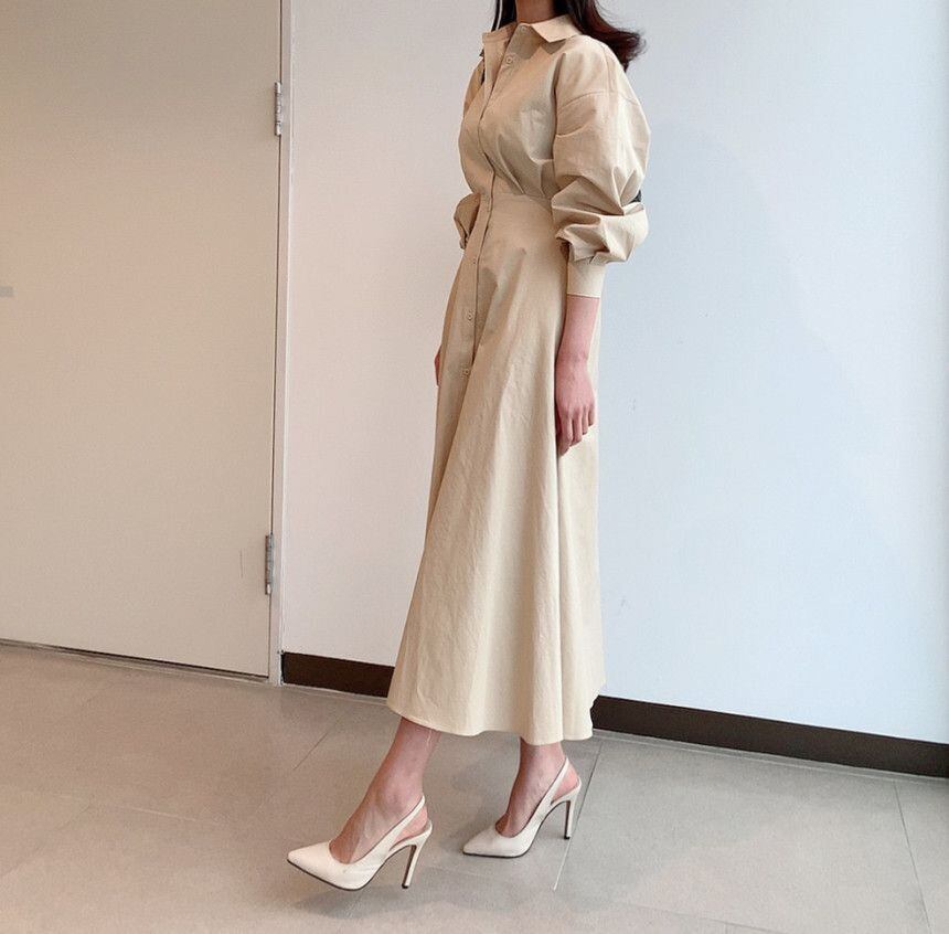 全3色 ウエストゴムシャツワンピース ワンピース シャツワンピース 膝下 ミモレ丈 ミディアム丈 長袖 パフスリーブ ボリューム袖 襟付き Aライン ハイウエスト 清楚 フロントボタン かわいい 大人可愛い シンプル きれいめ カジュアル 上品 おしゃれ お洒落 こなれ感 無地 春 秋 レディース 通勤 学生 通学 デート お出かけ 休日 普段使い 韓国系 オルチャン 白 ホワイト 青 ブルー ベージュ 韓国コーデ 韓国ファッション