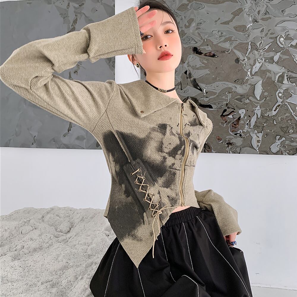 ジップアップシャツブラウス 編み上げ 切りっぱなし クロップド モード系 長袖 イレギュラー 不揃い 袖長め 襟あり トップス グラフィティプリント 落書き風プリント やわらかタッチ 大人可愛い きれいめ シンプル カジュアル 大人 上品 おしゃれ お洒落 かっこいい 大人可愛い 大人女子 こなれ感 ラフ ラブリー キュート ガーリー 個性的 レディース ビジネス OL 通勤 学生 通学 デート 体系カバー 韓国コーデ 韓国ファッション カーキ ベージュ 黒 ミックスカラー