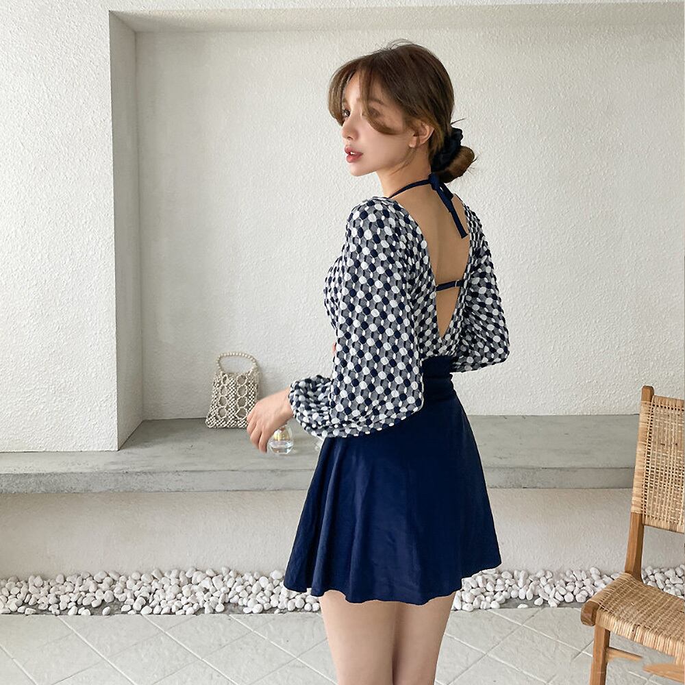 水着 重ね着風ワンピース フレアスカート フレア 体型カバー 露出控えめ 露出少ない 長袖 ラッシュガードワンピース水着 ラッシュガード 日焼け止め 白肌 盛れる 濃紺 ネイビー 胸元クロス カットアウト ふんわり袖 二の腕カバー Vネック 日焼け防止 ドット風 胸パッド付き ワイヤーなし かわいい 大人可愛い カジュアル エキゾチック エスニック 華やか 大人 おしゃれ 主役級 存在感 女っぽ キュート レディース M L LL 韓国コーデ 韓国ファッション 水玉 ネイビー