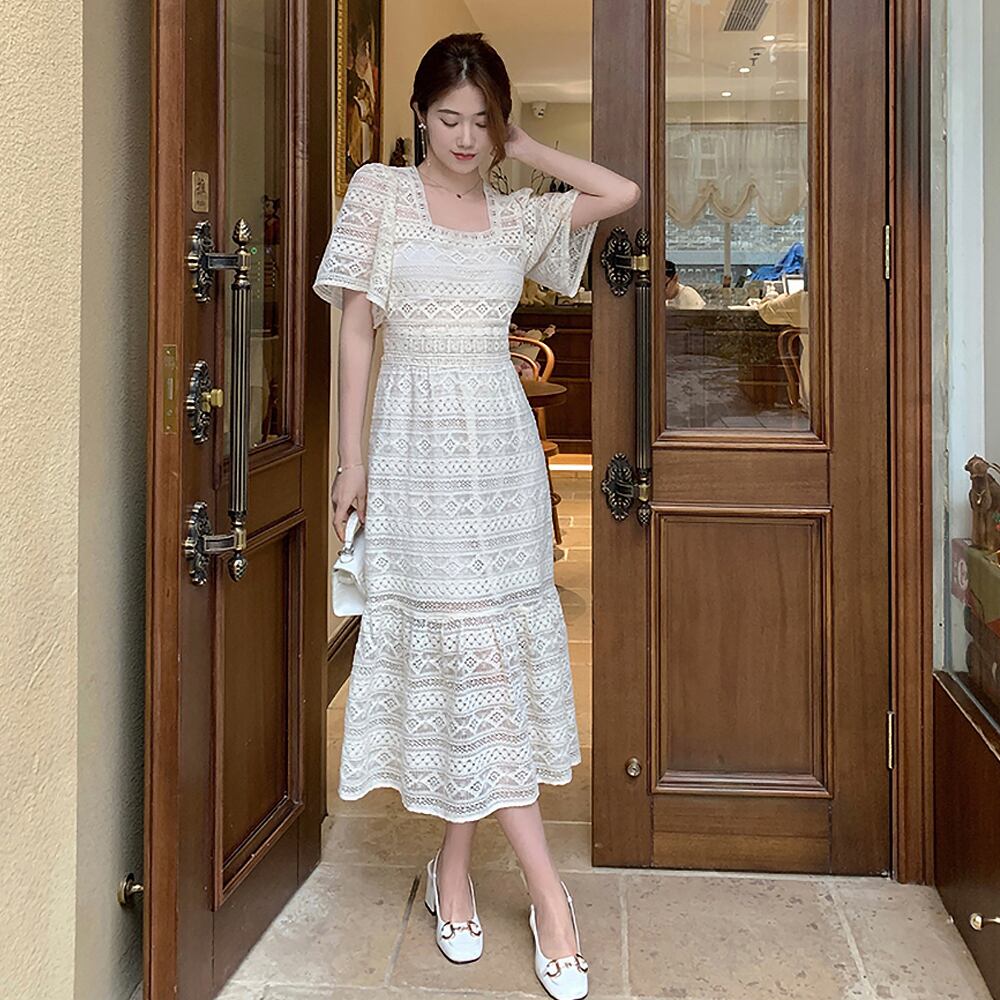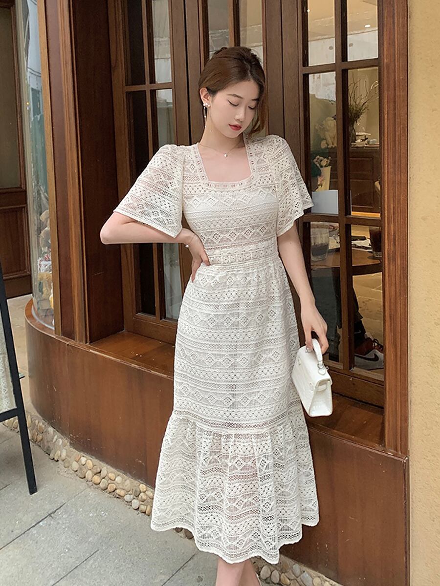 総レースワンピース ワンピドレス ミモレ丈 袖あり 半袖 スクエアネック 襟なしフィッシュテール マーメイド レース ハイウエスト 透け感 大人可愛い きれいめ 大人 上品 おしゃれ 大人女子 こなれ感 ラフ キュート エレガント 主役級 存在感 春 夏 レディース 学生 通学 デート お出かけ 女子会 休日 リゾート 旅行 海 プール 着回し 普段使い 韓国 オルチャン ファッション コーデ スタイル S M L クリーム 韓国コーデ 韓国ファション