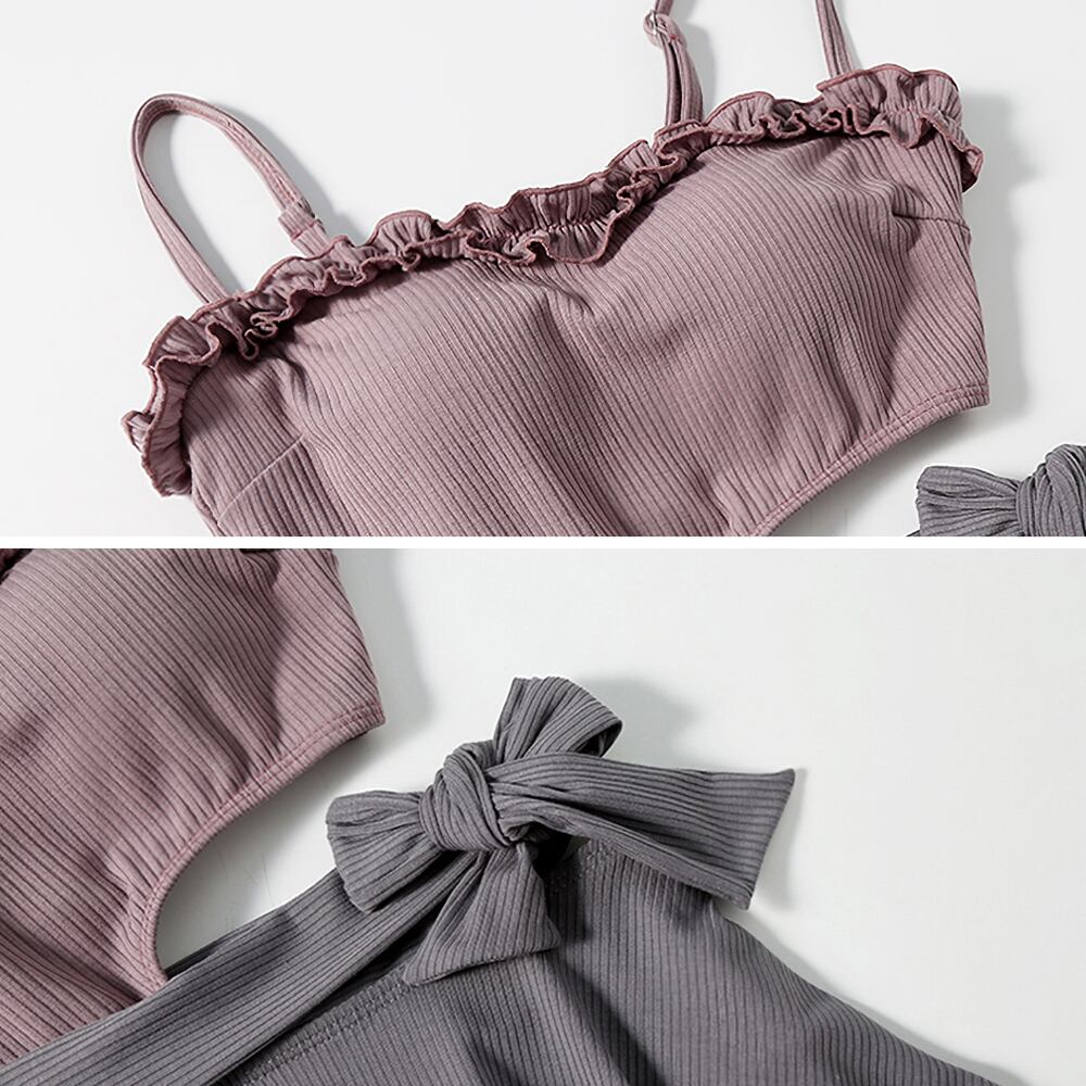 落ち着いた色合いに胸元に小さめのフリルがあり、片方のサイドにカットアウトとリボンがある大人可愛いワンピース水着です。