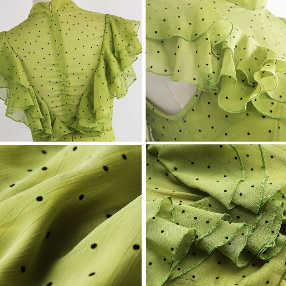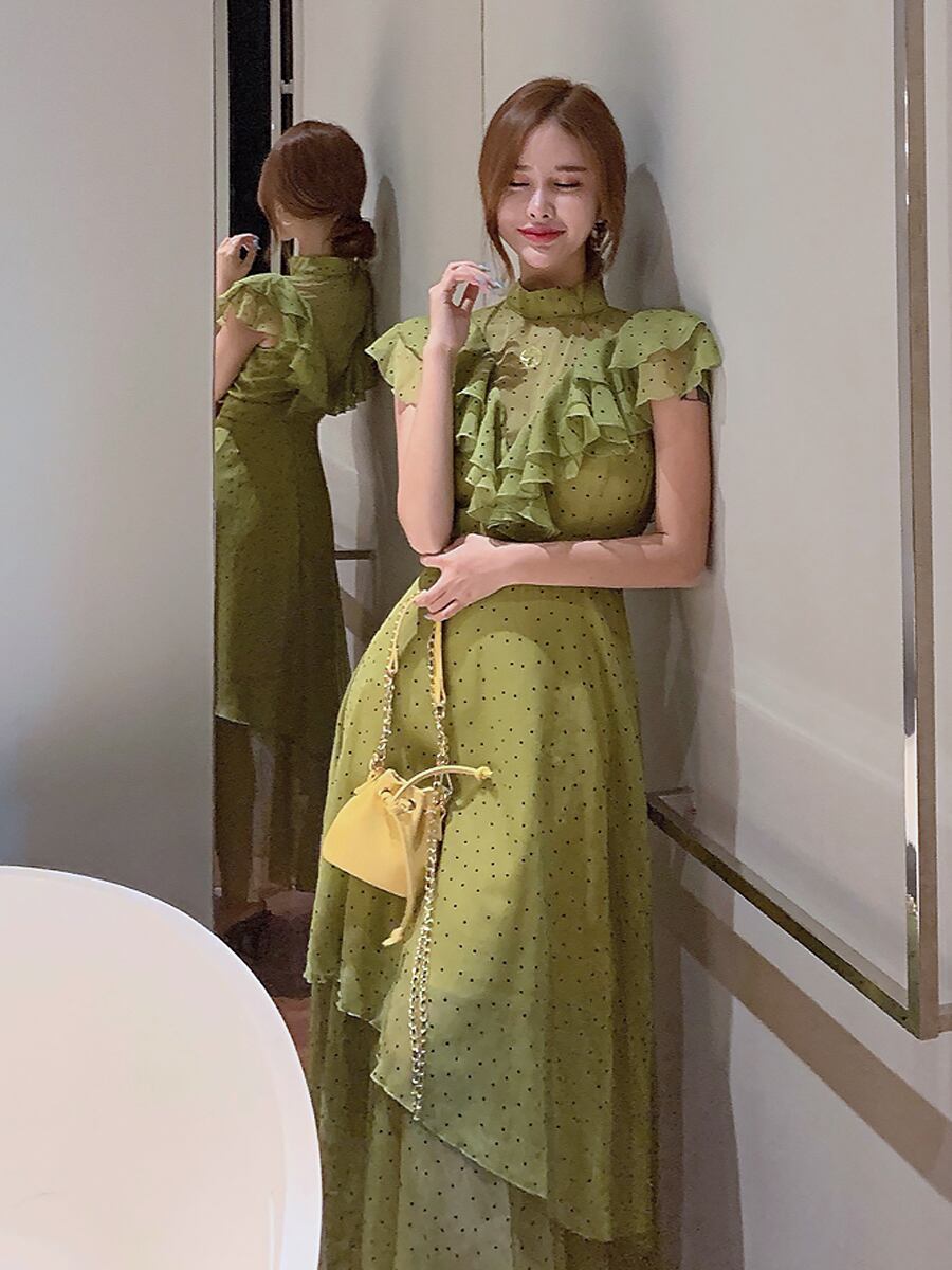 グリーンドット柄ラッフルロングドレス ワンピースドレス ワンピース フレアワンピース アシンメトリー ワンピドレス ロング 袖なし 縦フリル ハイネック 透け感 エレガント 演奏会 発表会 Aライン パーティドレス 緑 グリーン ドット 水玉 ウエストマーク 透け感 キレイめ 上品 薄手 かわいい 大人可愛い きれいめ シンプル 上品 おしゃれ お洒落 大人女子 こなれ感 ラブリー キュート ガーリー エレガント グリーン