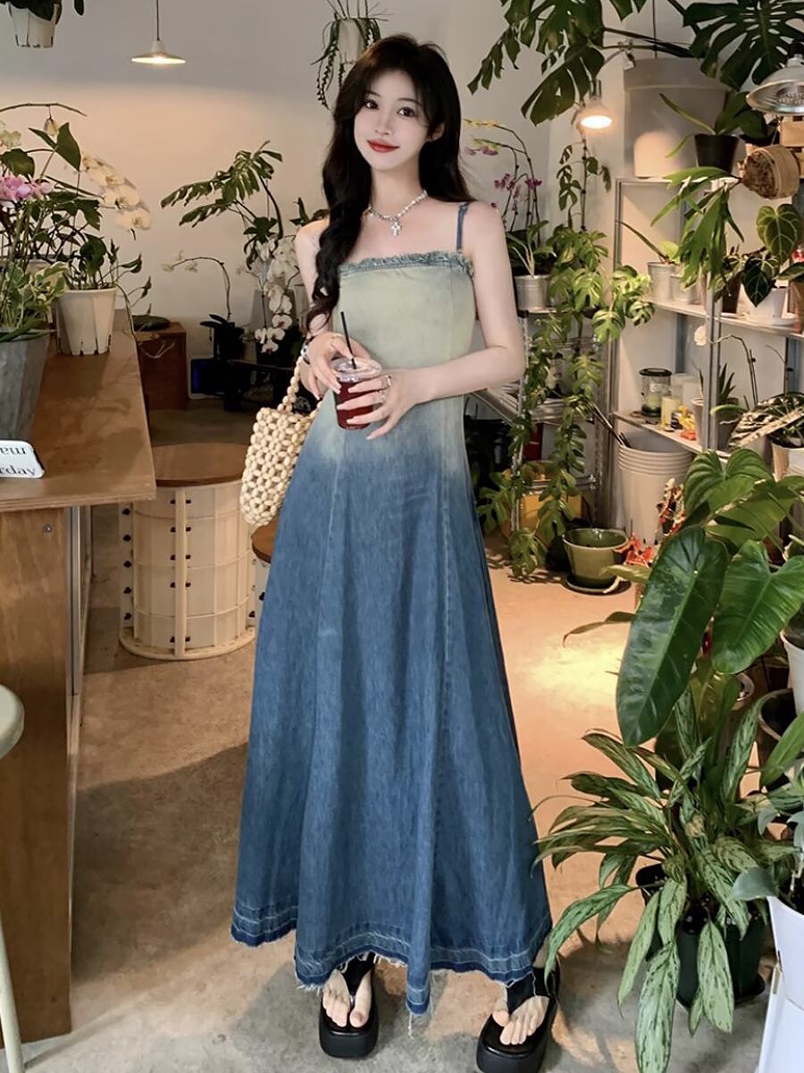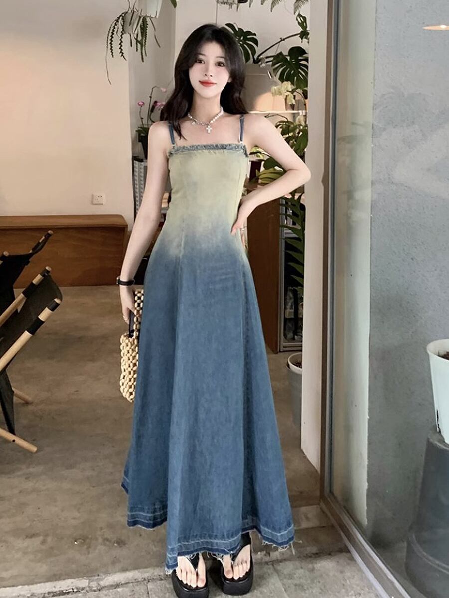 デニムグラデーションキャミソールロングワンピース ワンピース デニム グラデーション ロング マキシ キャミソール キャミワンピ リゾートワンピース リゾートワンピ 肩出し フレア フリンジ ビーチ 海 旅行 かわいい 大人可愛い きれいめ おしゃれ お洒落 かっこいい レトロ 大人女子 こなれ感 ラブリー キュート ガーリー 個性的 モード系 エレガント モダン 主役級 存在感 抜け感 韓国コーデ 韓国ファッション ブルー