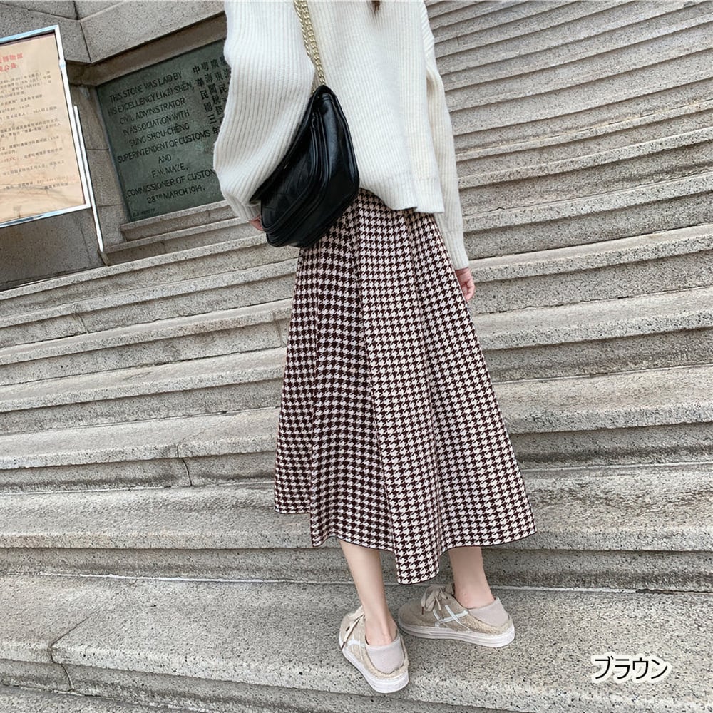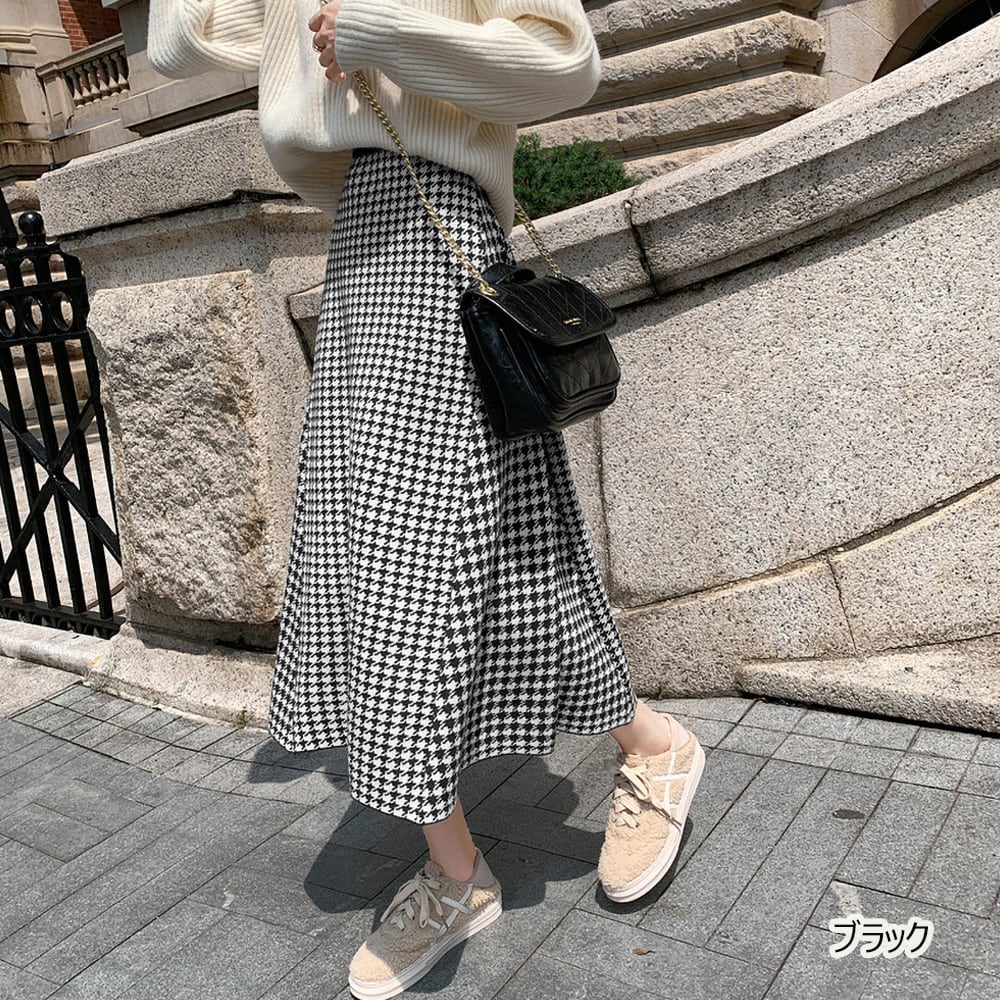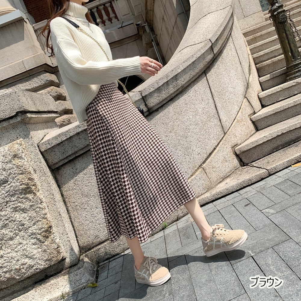 全2色 超楽ちん フレアスカート ミモレ丈 Aライン ハイウエスト ハイゲージニット 伸縮性あり かわいい 大人可愛い きれいめ シンプル 大人 上品 おしゃれ 大人女子 こなれ感 ラフ キュート エレガント 主役級 存在感 千鳥格子 秋 冬 レディース オフィス ビジネス OL 通勤 学生 通学 デート お出かけ 着回し 普段使い 重ね着 韓国 オルチャン ファッション コーデ スタイル 楽ちん 脚長 フリーサイズ 黒 茶色 韓国コーデ 韓国ファション