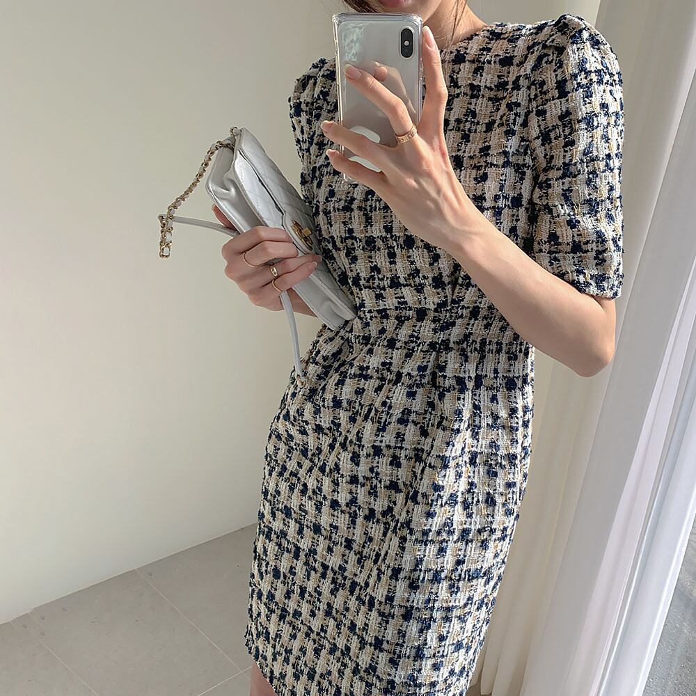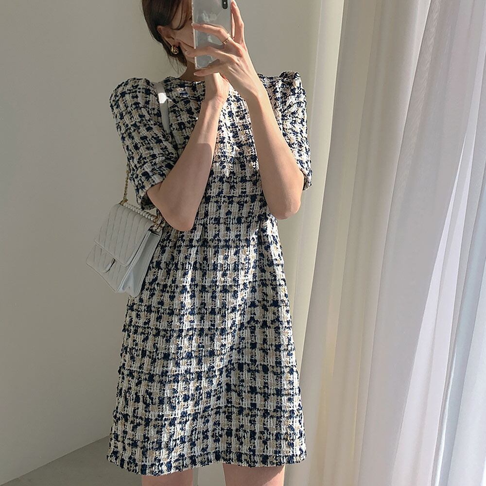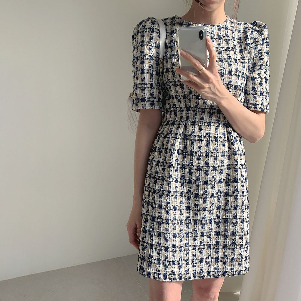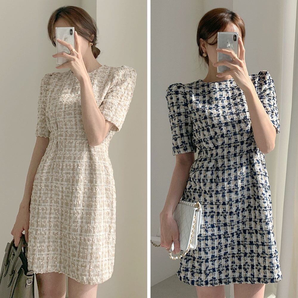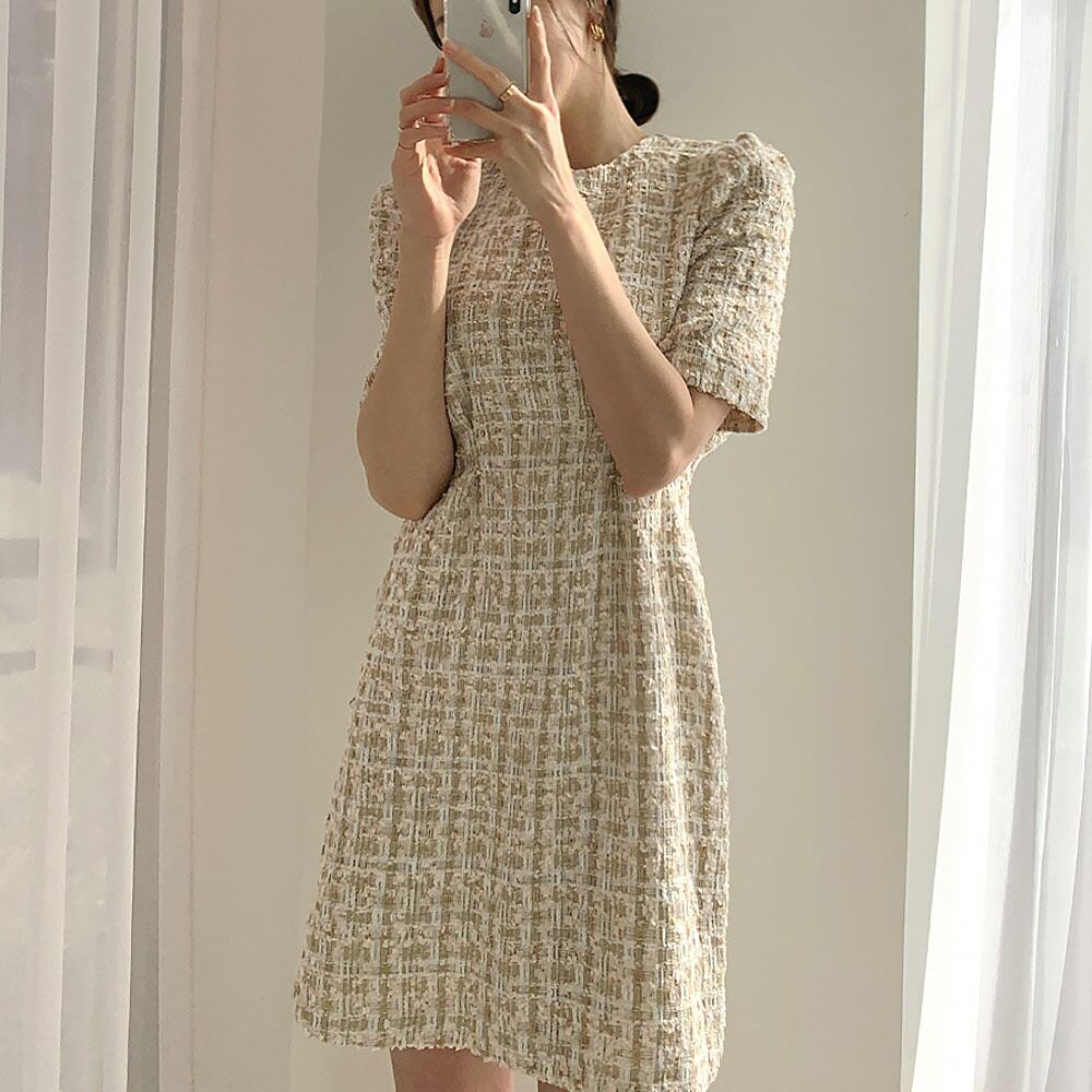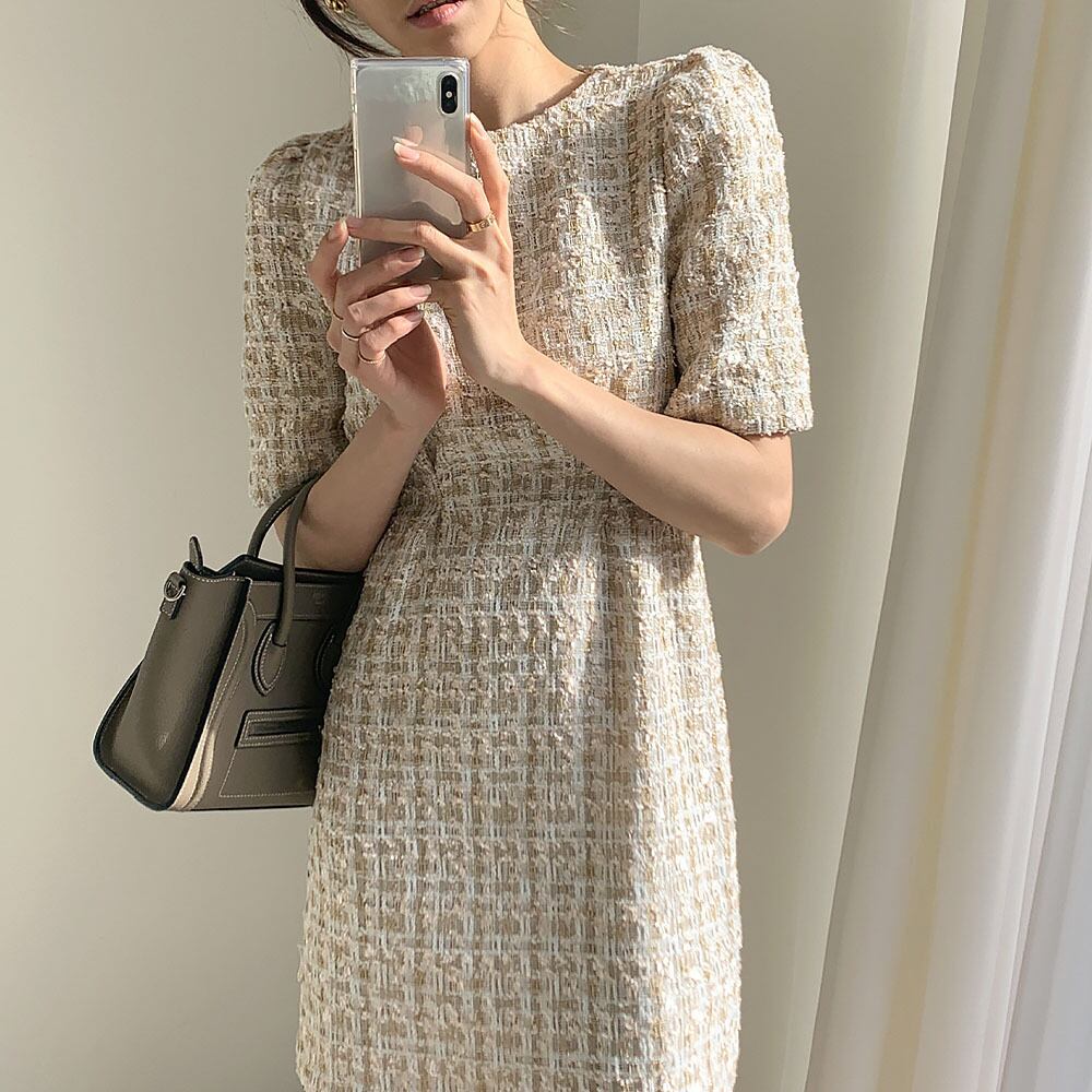 全2色 ツィードミニワンピース ツィードワンピース ラウンドネック ボタン チュニック ミニ ミニ丈 ショート ショート丈 膝上 袖あり 五分袖 半袖 パフスリーブ 襟付き フレア Aライン シンプル カジュアル モード系 リボン ウエストマーク こなれ感 ぬけ感 無地 かわいい おしゃれ お洒落 ラブリー キュート 春 夏 秋 レディース 存在感 女性用 デート お出かけ ファッション コーデ スタイル モテ オルチャン S M ベージュ ブラック 韓国コーデ 韓国ファッション