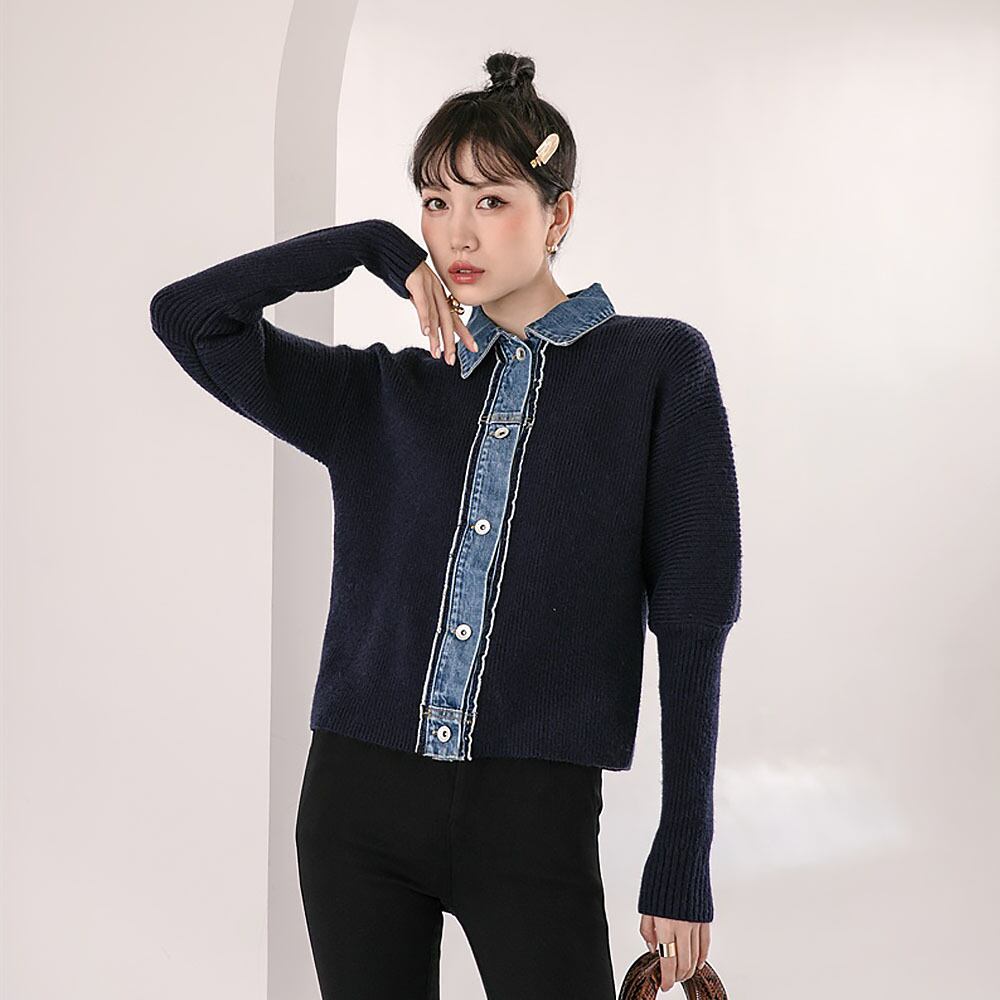 ニットとデニムのドッキングカーディガン デニムステッチニット 切り替えデザイン デニム ボタン 襟デニム セーター シンプル ナチュラル 前開き カジュアル 大人 上品 おしゃれ お洒落 ゆったり ゆる かっこいい こなれ感 クール モード系 モダン コーデ 羽織り 重ね着 前開き ボタン 体型カバー ファッション 主役級 存在感 抜け感 無地 春 秋 冬 10代 20代 30代 40代 レディース 通勤 学生 通学 デート お出かけ 防寒 ネイビー フリーサイズ 韓国コーデ 韓国ファション