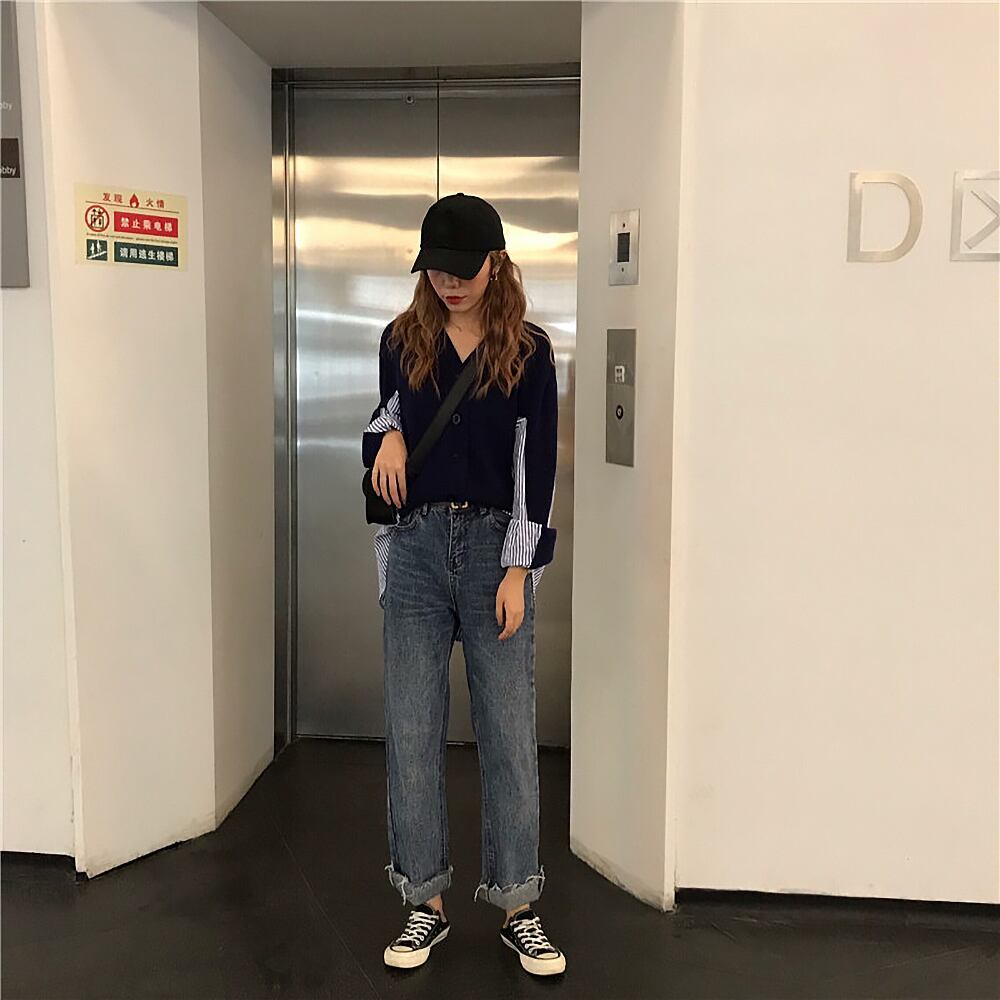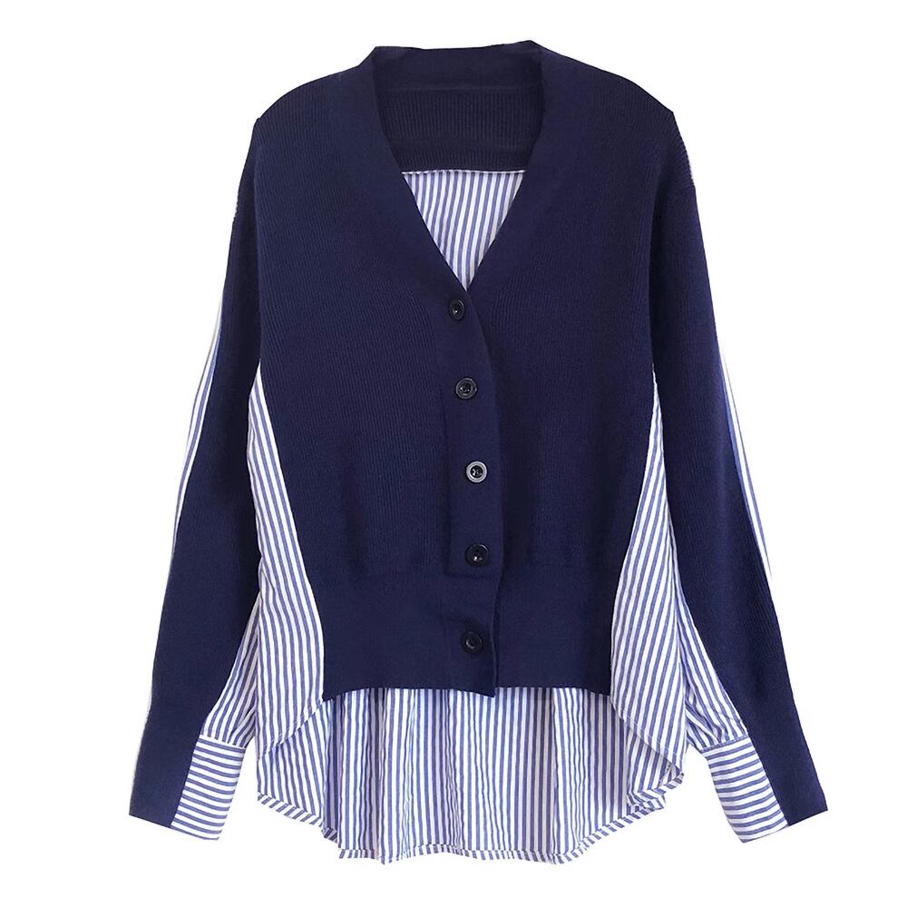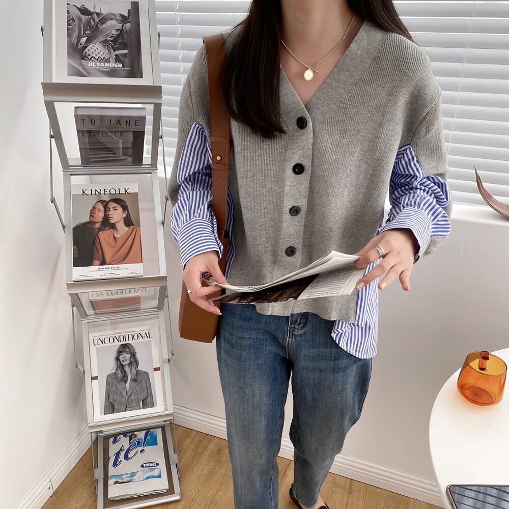 全2色 ドッキングニットカーディガン ドッキングシャツブラウス カットソー カーディガン 袖あり 長袖 萌袖 Vネック 襟なし 切り替えデザイン かわいい 大人可愛い きれいめ シンプル カジュアル 大人 おしゃれ お洒落 大人女子 こなれ感 ラフ メンズライク ボーイッシュ キュート ルーズ 柄 ストライプ 春 秋 冬 レディース オフィス 通勤 学生 通学 デート お出かけ 休日 旅行 着回し 普段使い 重ね着 楽ちん 暖かい 防寒 モテ 韓国コーデ 韓国ファッション 灰色 濃紺