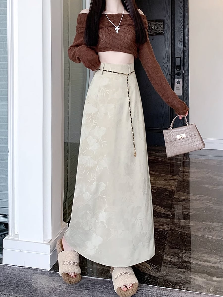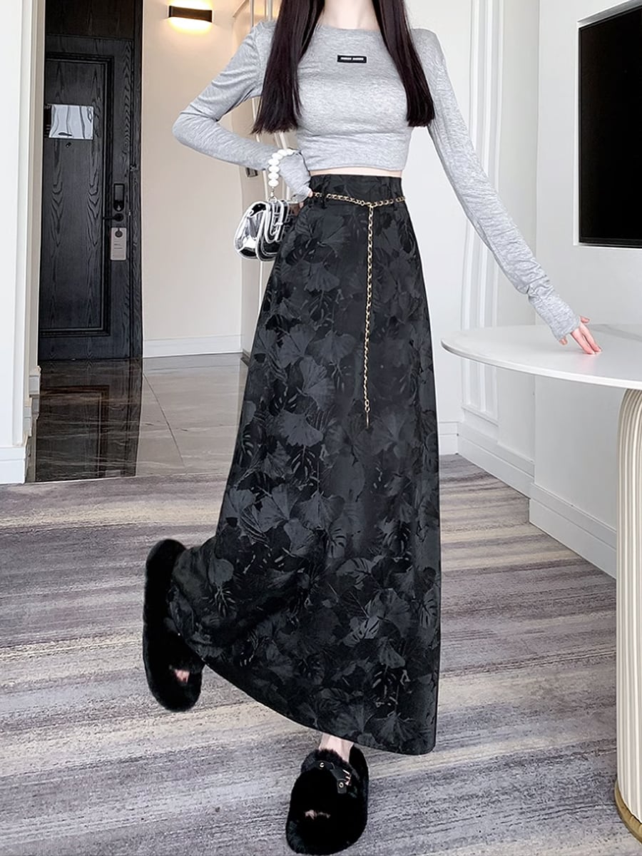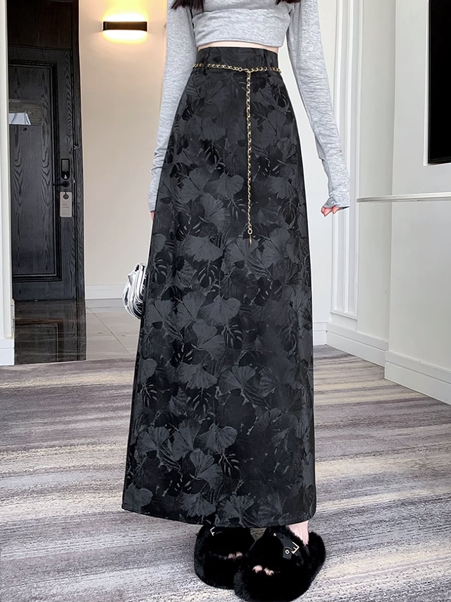 ナチュナルな葉柄がきれいなチェーンベルト付きのフェイクレザーのロングスカートです。