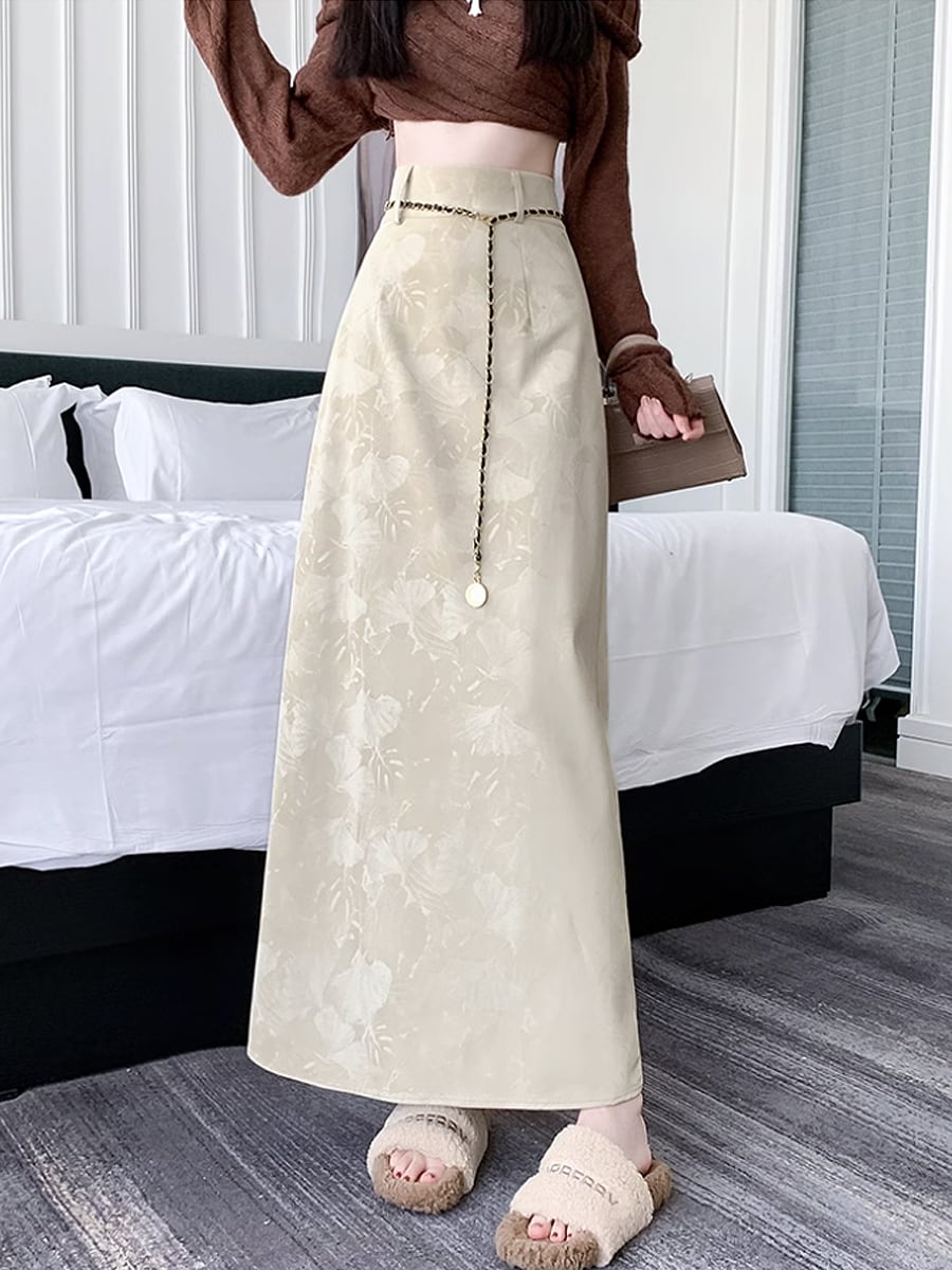 全3色 PUレザー 花柄チェーンベルト付きロングスリットセミフレアスカート 葉柄 リーフプリント タイト 細身 バックスリット 長め ハイウエスト かわいい 大人可愛い きれいめ シンプル カジュアル 大人 上品 おしゃれ 大人女子 こなれ感 キュート クール セクシー 主役級 存在感 無地 秋冬 レディース オフィス 通勤 学生 通学 デート お出かけ 休日 旅行 着回し 普段使い 脚長 韓国コーデ 韓国ファッション 黒 茶色 アイボリー 白 ベージュ アプリコット ブラック ブラウン