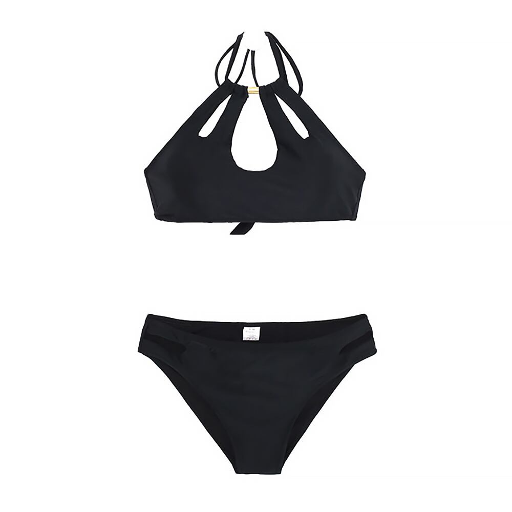 水着 ホルターネックカットアウトビキニ スイムウェア ビキニ セパレート 黒 胸元カットアウト パッド付き ワイヤーなし スポーティ スポーティビキニ 体系カバー 谷間魅せ シンプル バックリボン ビキニボトムカットアウト かわいい 大人可愛い セクシー 大人 大人っぽい おしゃれ 主役級 存在感 個性的 モード系 モダン かっこいい レディース 海 ビーチ プール リゾート バカンス 美脚 脚長 スタイル 高見え 格上げ モテ S M L 韓国コーデ 韓国ファッション