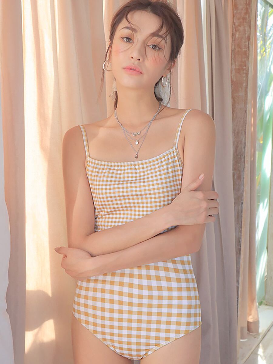 水着 イエローギンガムチェックワンピース モノキニ チェック柄 ギンガムチェック ブロックチェック スイムウェア 胸パッドあり ワイヤーなし ウエスト切り替え ウエストマーク 背中開き バックコンシャス バックシャン 背中美人 ビタミンカラー レトロ モダン フェミニン セクシー おしゃれ 個性的 レディース ホテル 温泉 海 ビーチ プール リゾート 旅行 着痩せ スタイルアップ 体型カバー オルチャン M L XL 韓国コーデ 韓国ファッション 黄色 オレンジイロエー