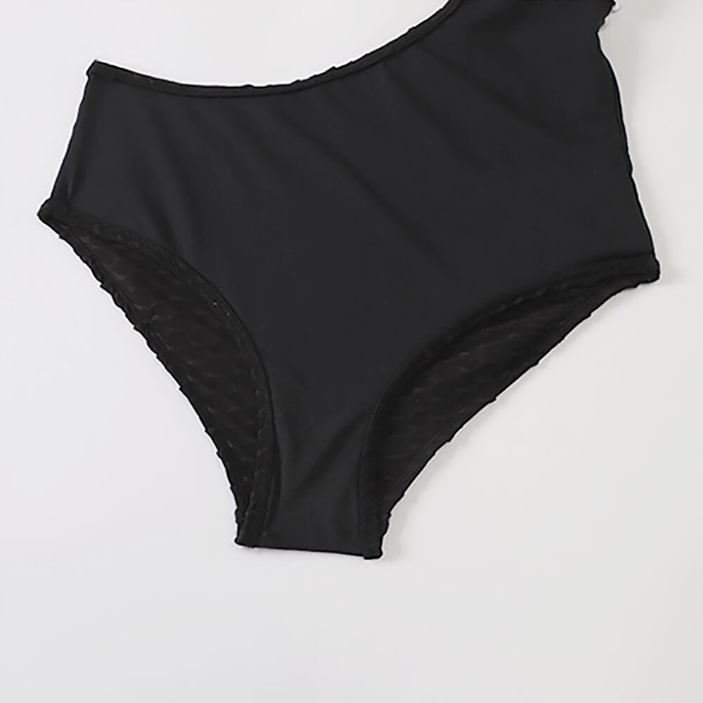 質感のある生地のウエストカットデザインと肩リボンが特徴のバイカラーのワンピース水着です。