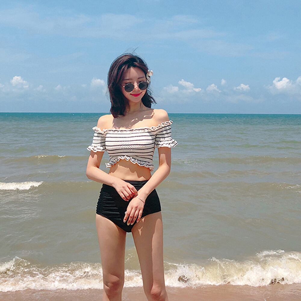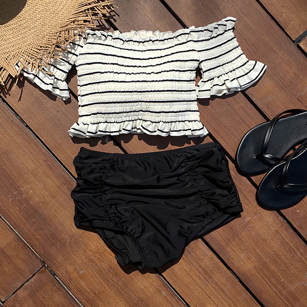 水着 ストライプオフショルダーシャーリングタンキニ ビキニ ブラック 黒 白 ホワイト ボーダー ストライプ オフショル オフショルダー シャーリング ハイウエスト パッド付き ワイヤーなし スタイリッシュ 露出少なめ 露出控えめ ガーリー キュート かわいい おしゃれ モード系 モダン ラブリー レディース 海 ビーチ プール リゾート バカンス 美脚 脚長 スタイル 高見え 格上げ モテ M L LL 韓国コーデ 韓国ファッション