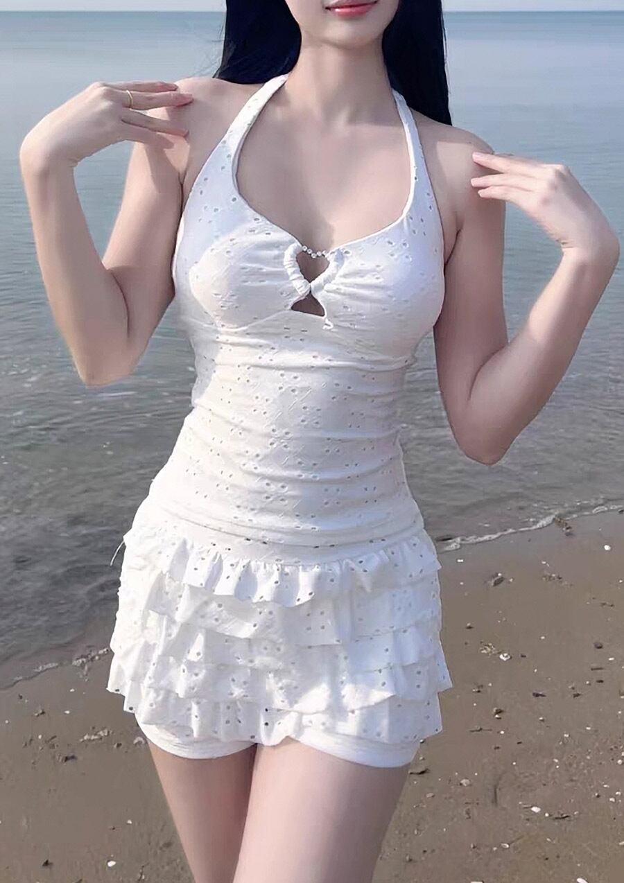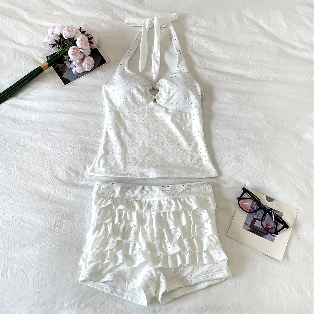 水着 セパレート水着 ホワイトレース ツーピース ビキニ タンキニ セパレート ビキニ 白 ホワイト レース生地 フリフリ ティアード ティアードパンツ ショートパンツ フレアパンツ フリフリパンツ フレア ホルターネック ハート型リング Vネック ハート 体型カバー スポーティ きれいめ フェミニン かわいい パッド付き ワイヤーなし 伸縮性 セット 上下セット かわいい 大人可愛い きれいめ セクシー おしゃれ スタイリッシュ 美脚 脚長 スイムウェア