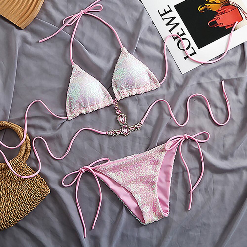 ビジューがついたホルターネックのスパンコールビキニです。