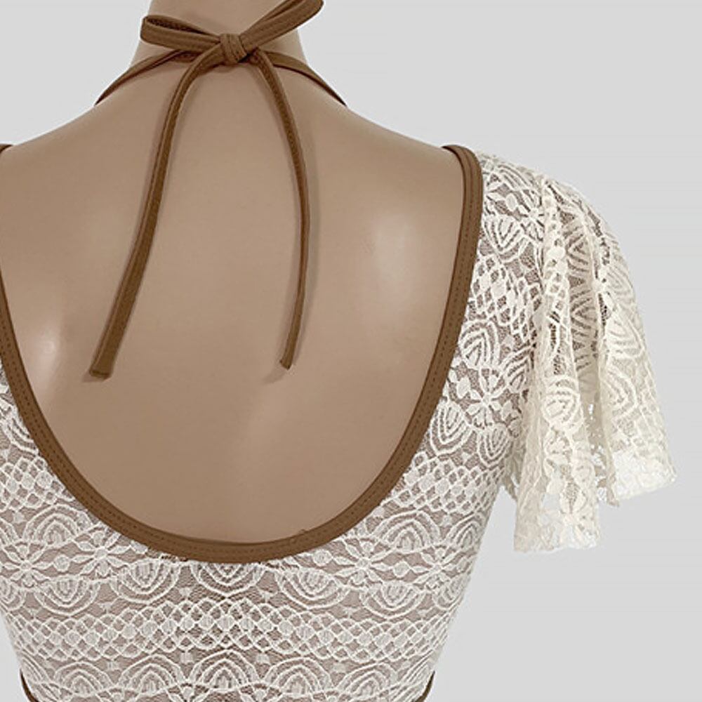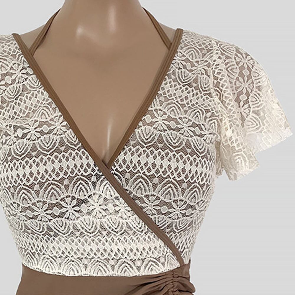 水着 袖付きカシュクールワンピース 半袖 レース重ね レース スカート付き ドロストスカート ホルターネック 二の腕カバー Vネック カシュクール風 フレアスリーブ パイピング 茶色 ブラウン 胸パッド付き ワイヤーあり かわいい 大人可愛い カジュアル エキゾチック エスニック 大きいサイズ 華やか 大人 おしゃれ 主役級 存在感 女っぽ キュート レディース M L LL 韓国コーデ 韓国ファッション 韓国コーデ 韓国ファッション