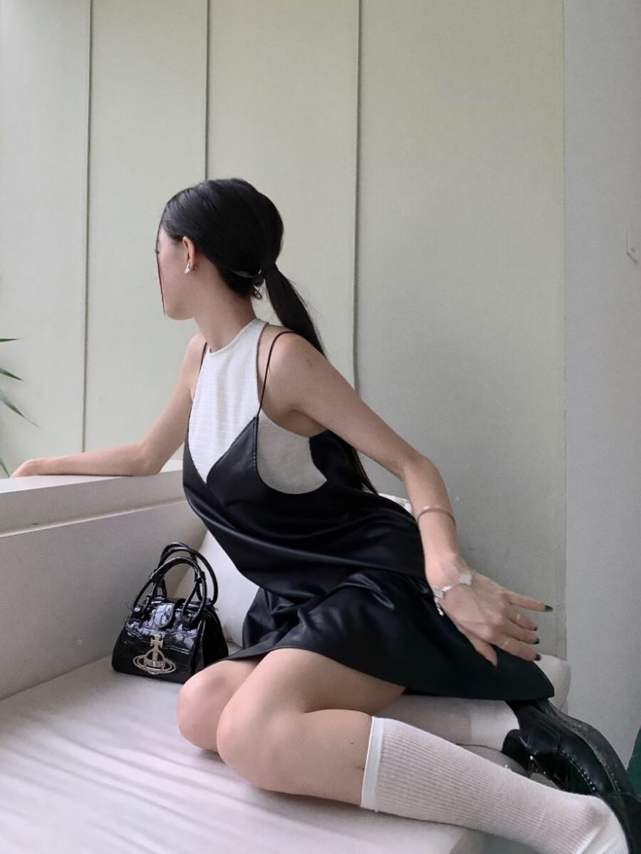 PUレザーのキャミソールワンピースにノースリーブのインナーがドッキングにされたミニ丈のワンピースです。
