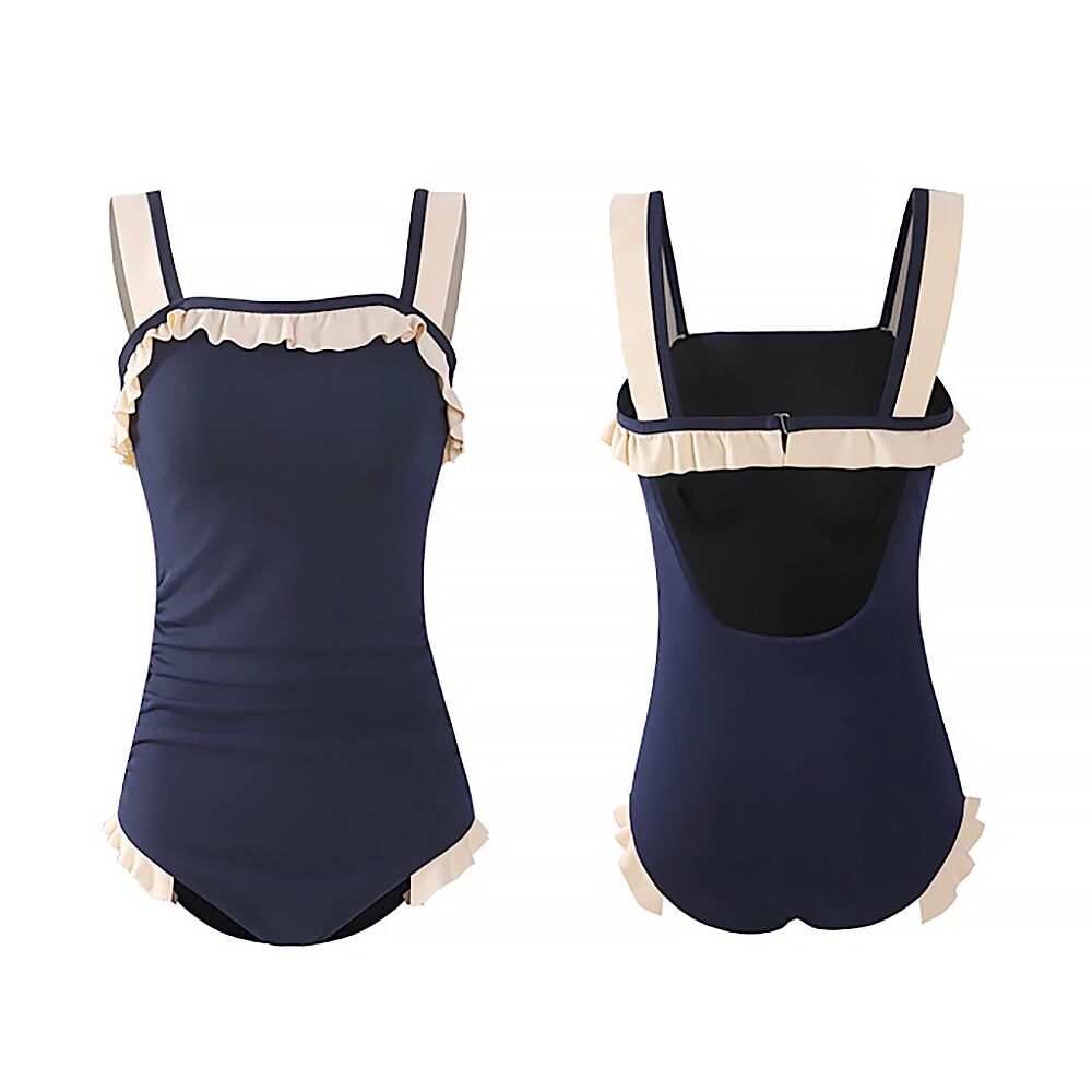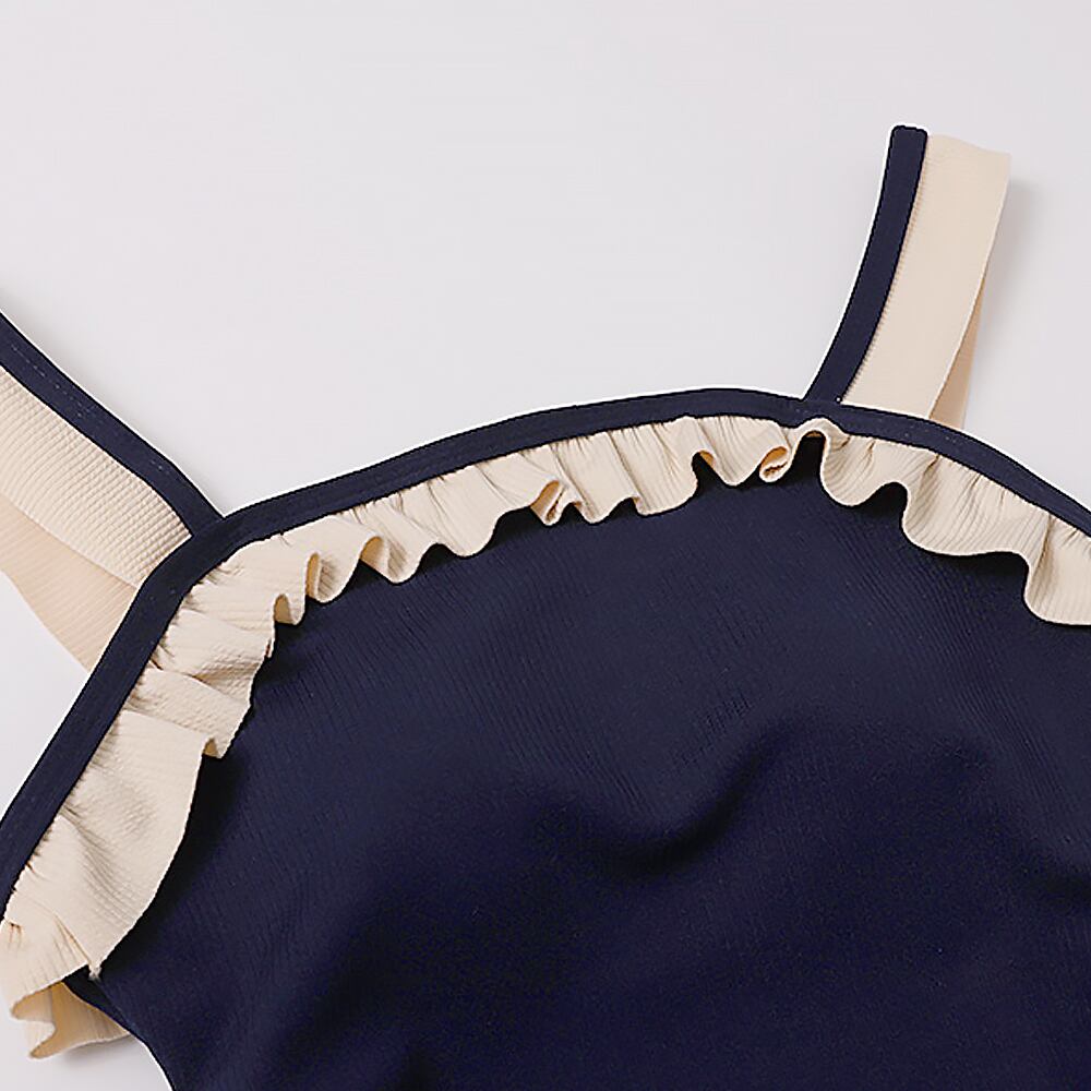 全2色 水着 バックカットフリルニットワンピース水着 ワンピース水着 オールインワン バックリボン 縁取り バイカラー 配色 パット付き ワイヤーなし シャーリング シンプルデザイン 胸元高め かわいい セクシー 大人可愛い ナチュラル おしゃれ ラブリー キュート ガーリー 10代 20代 30代 40代 レディース 女の子 ペアコーデ お揃い 海 ビーチ プール リゾート ハイウエスト セクシー 美脚 脚長 着痩せ 黒 紺 濃紺 韓国コーデ 韓国ファッション
