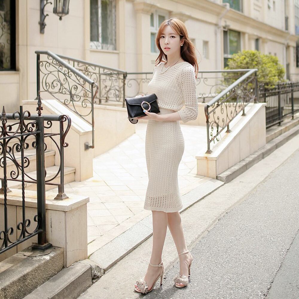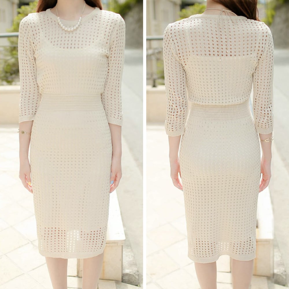 春ワンピ ニットワンピース インナーキャミソール付き 膝下 ひざ丈 袖あり 7分袖 七分袖 U ラウンドネック スリム タイト 細身 ストレート ウエストマーク 透け感 かわいい 大人可愛い きれいめ シンプル カジュアル きちんと感 大人 上品 おしゃれ お洒落 大人女子 キュート エレガント フォーマル 春 秋 入園式 10代 20代 30代 レディース 通勤 S M L XL 韓国コーデ 韓国ファッション オフホワイト