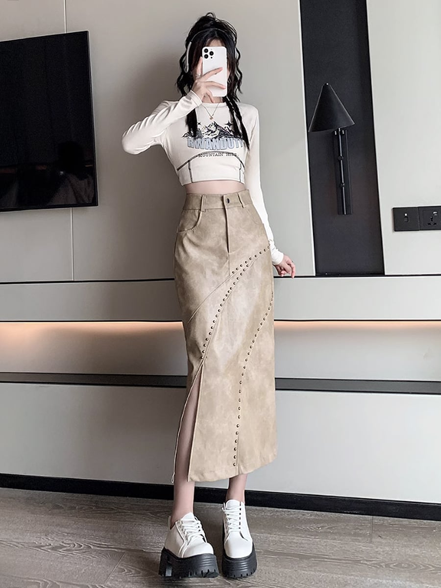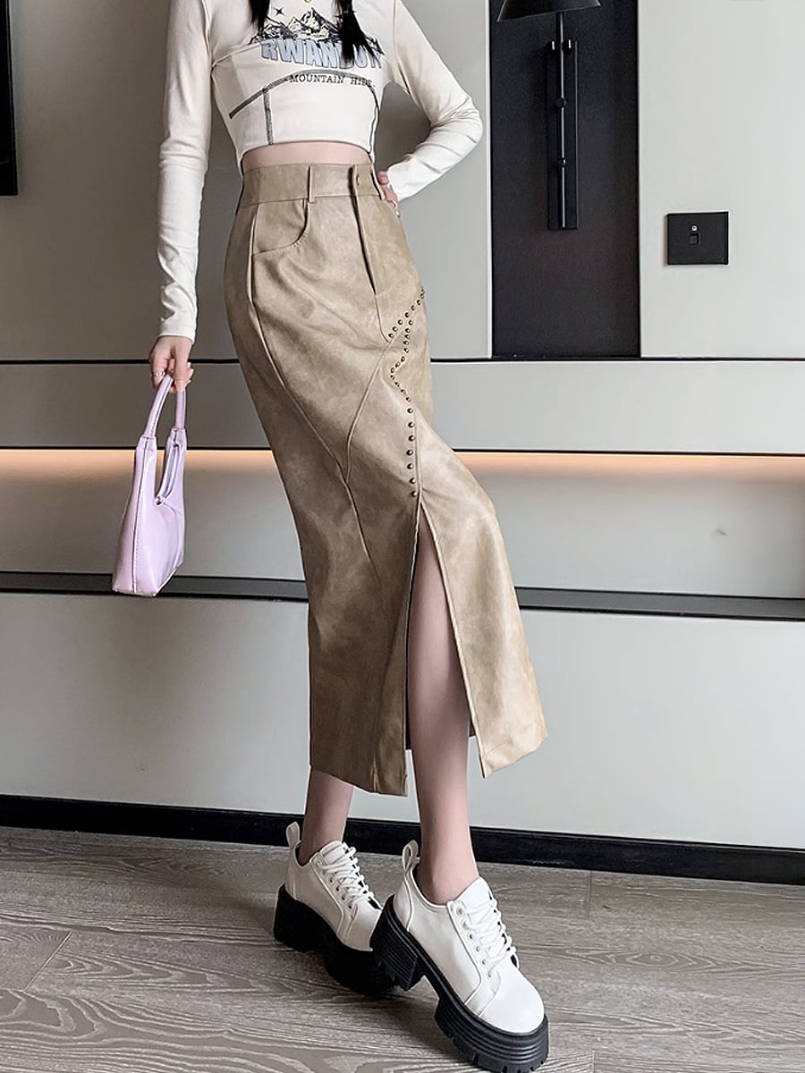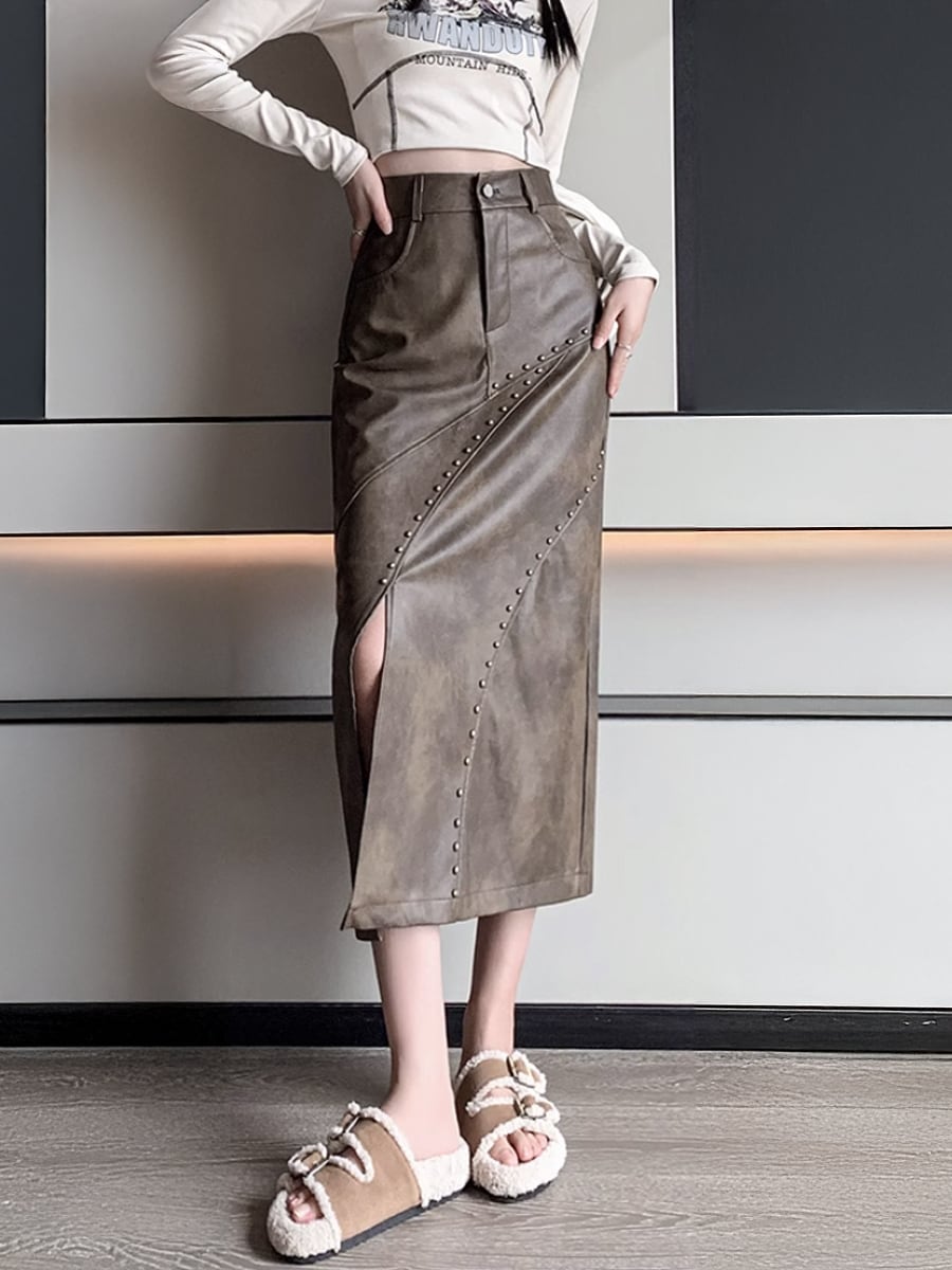 全3色 PUレザー スタッズ付きロングスリットタイトスカート 鋲付き スタッズ 鋲 膝下 タイト 細身 斜めスリット ハイウエスト かわいい 大人可愛い きれいめ シンプル カジュアル 大人 上品 おしゃれ 大人女子 こなれ感 キュート クール セクシー 主役級 存在感 無地 秋冬 レディース オフィス 通勤 学生 通学 デート お出かけ 女子会 休日 旅行 着回し 普段使い オルチャン 脚長 韓国コーデ 韓国ファッション 黒 茶色 ベージュ ブラック ブラウン