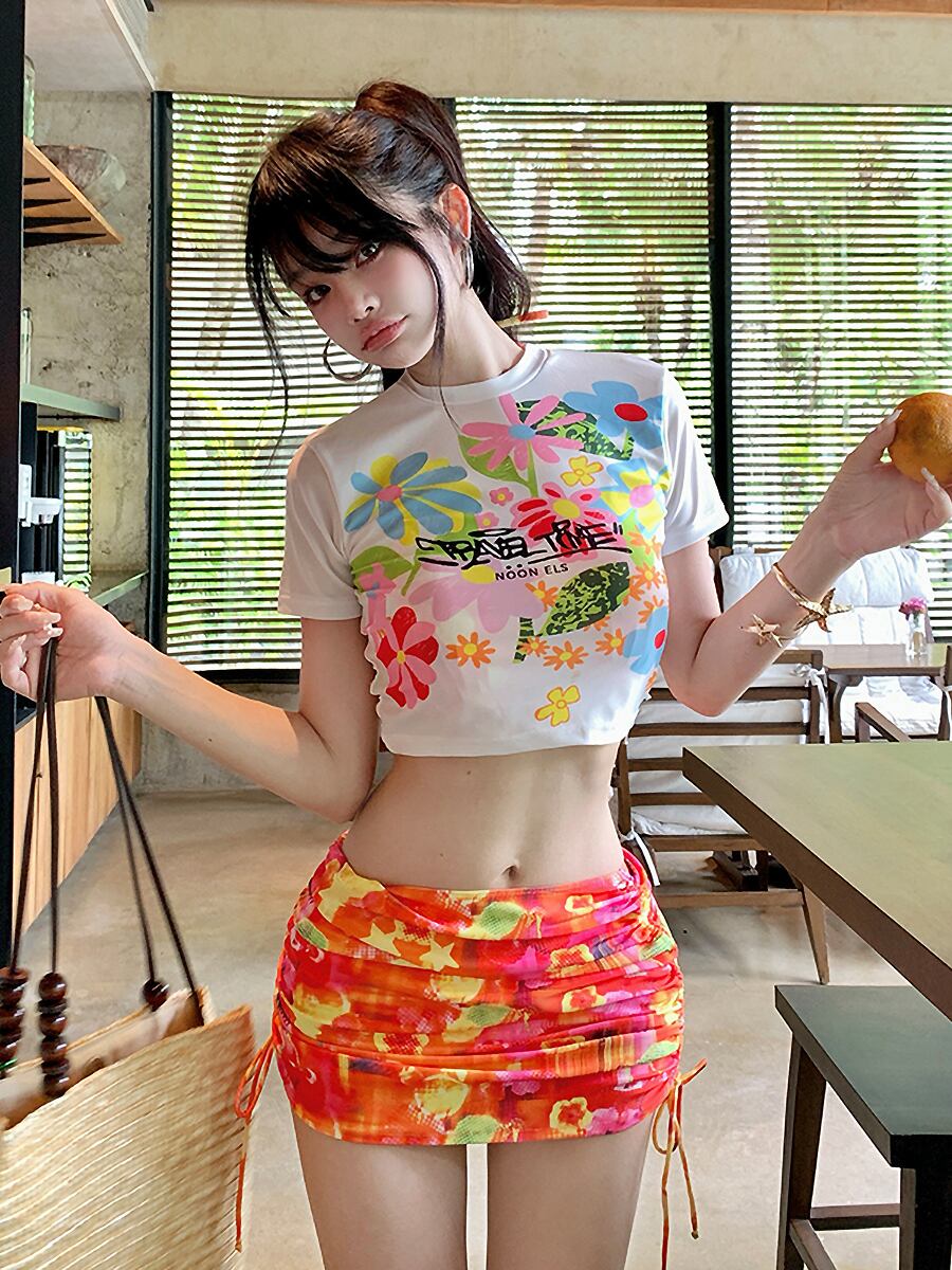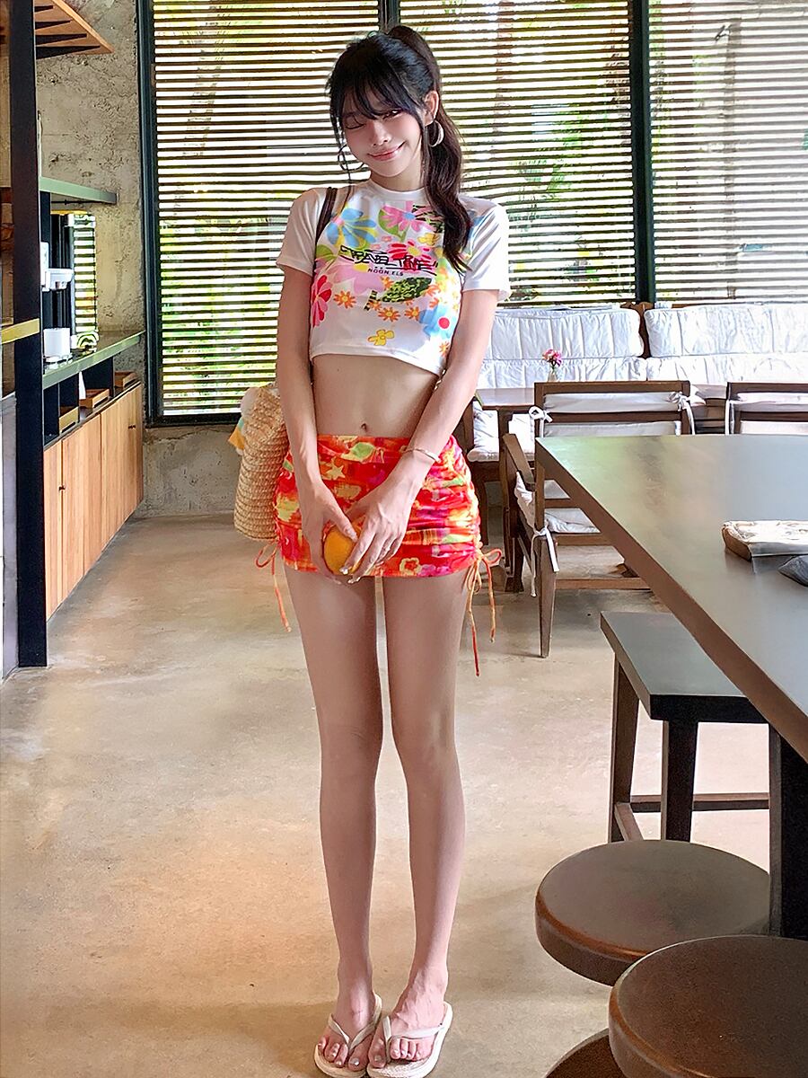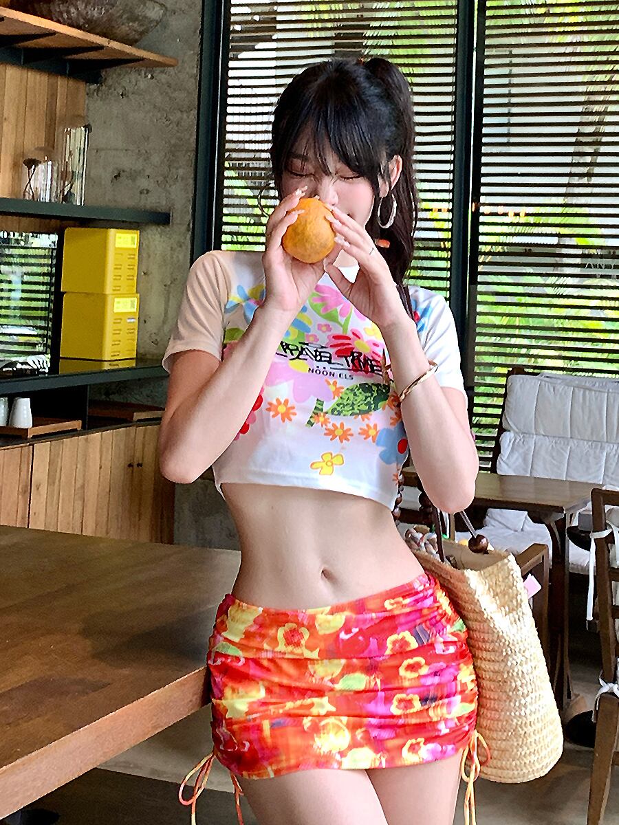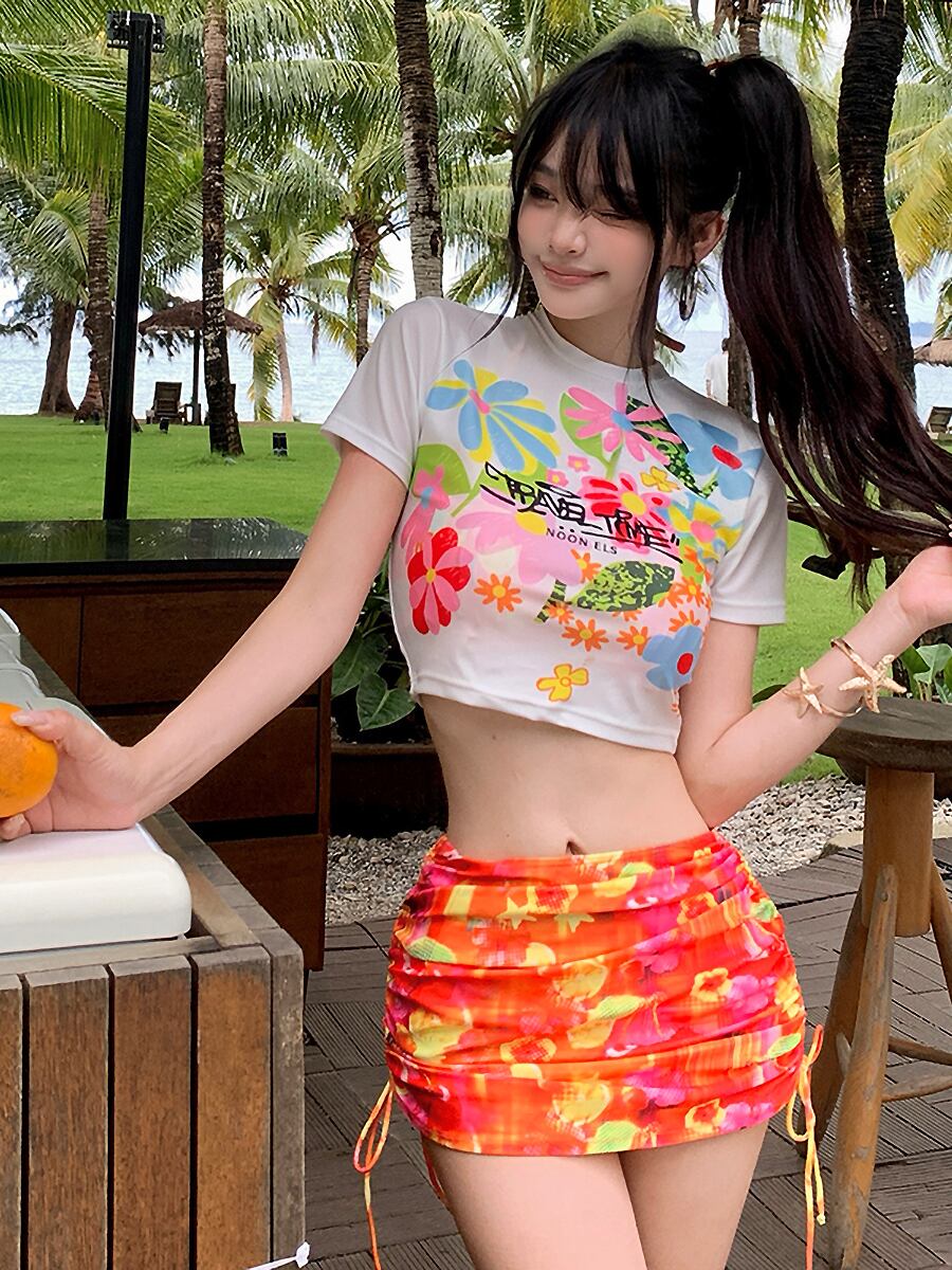 4点セット オレンジ花柄プリントビキニ上下+半袖オーバートップス+ドロストスカート 花柄 フラワープリント ホルターネック ビキニ ベーシックビキニ ガーリーフェミニン かわいい 日焼け防止 体型カバー パッド付き ワイヤー付き クロップド丈 セット かわいい 大人可愛い きれいめ セクシー sexy 華やか おしゃれ スタイリッシュ 美脚 脚長 韓国コーデ 韓国ファション オレンジ イエロー 黄色