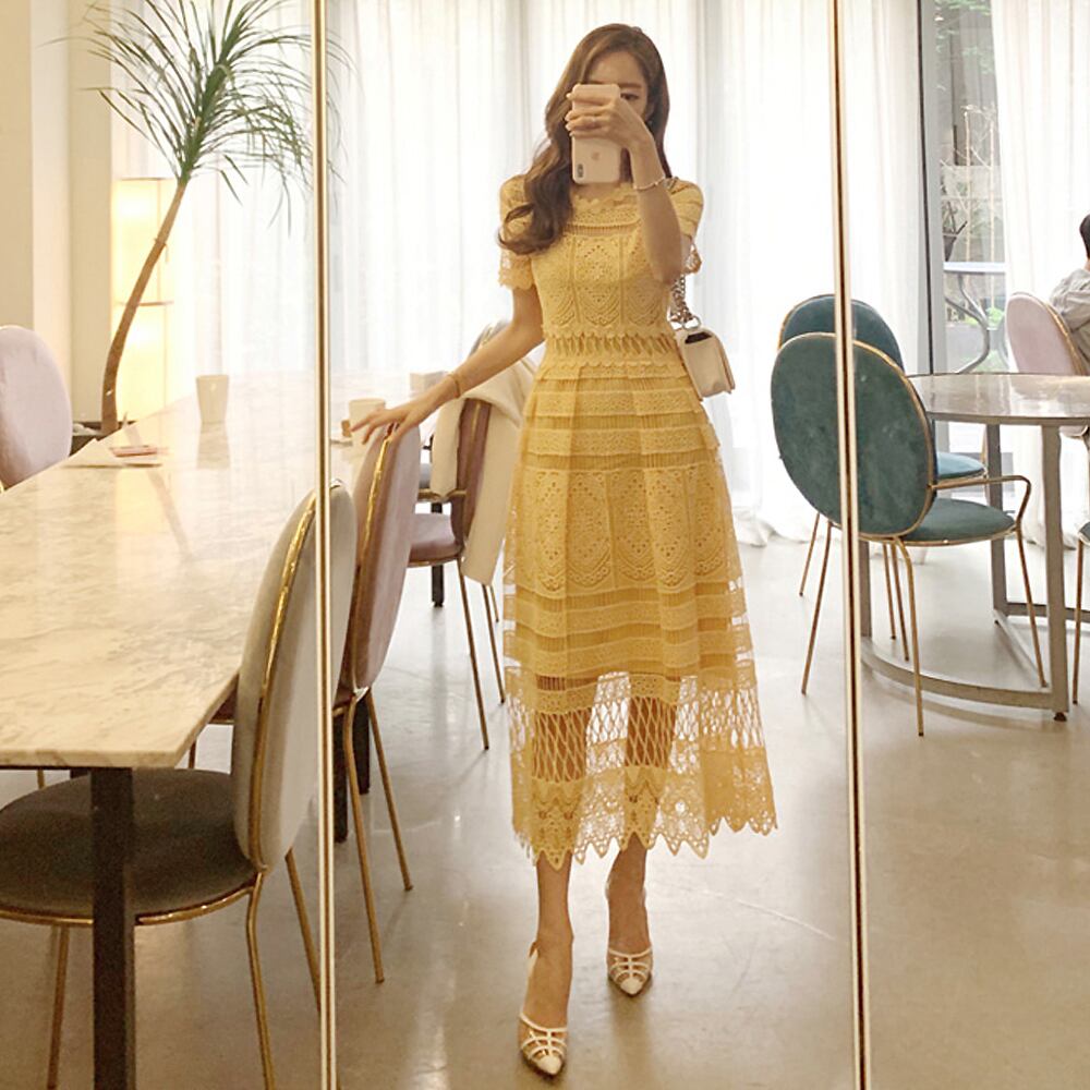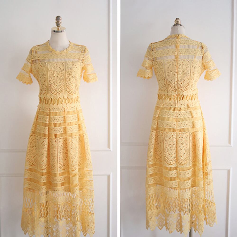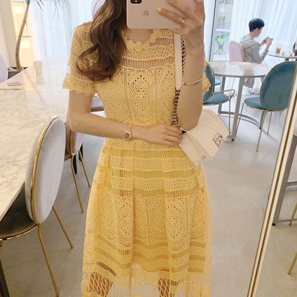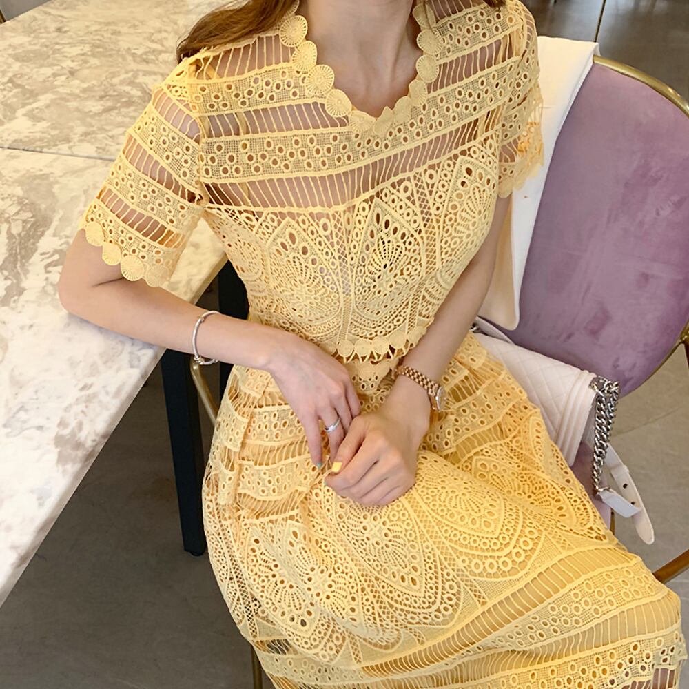 サマーコットンレースワンピース 総レース レースワンピ ワンピドレス 黄色 イエロー 透け感 膝下 ミモレ ロング 半袖 ラウンドネック スリム 細身 ストレート レース コットンレース かわいい 大人可愛い きれいめ 大人 上品 おしゃれ キュート エレガント フォーマル 春 夏 謝恩会 結婚式 二次会 披露宴 冠婚葬祭 10代 20代 30代 パーティー イベント ホテル レストラン 韓国 オルチャン 韓国ファション モテ サイズ フリーサイズ Aライン 韓国コーデ イエロー