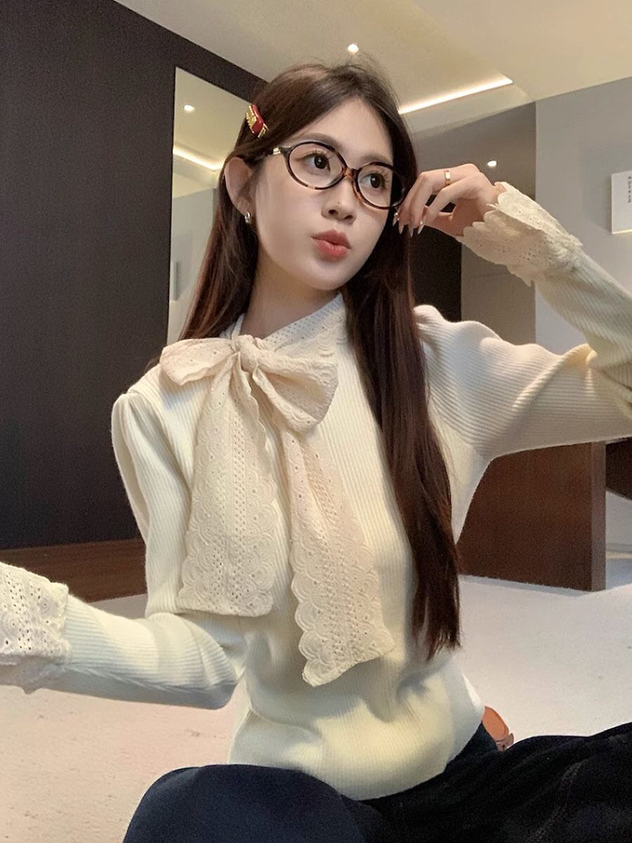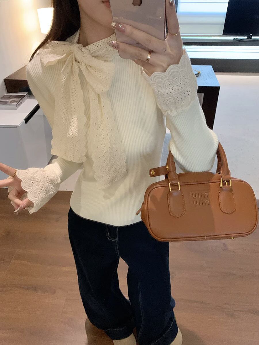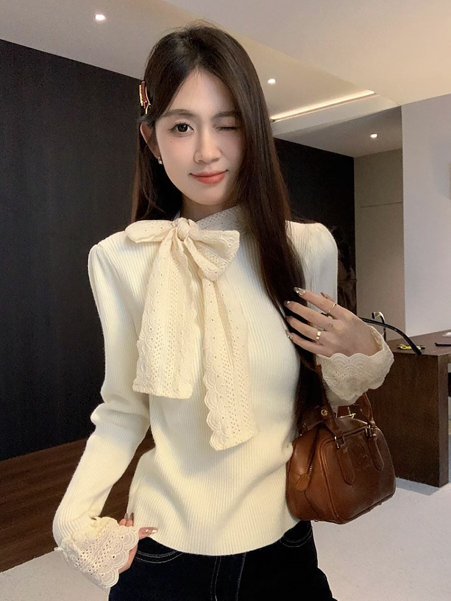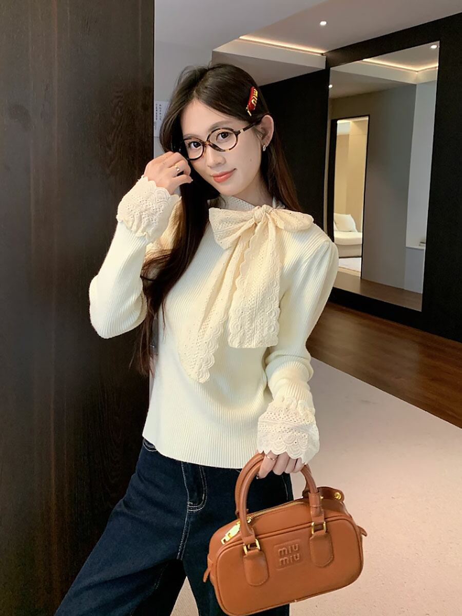ネックリボンハイゲージニット トップス 長袖 袖長め 袖口レース レースリボン 襟リボン 胸元リボン 秋冬 あたたか 防寒 リボン ボウタイ レース 刺繍 ガーリー 大人可愛い きれいめ きちんと感 シンプル カジュアル 大人 おしゃれ お洒落 大人女子 ラブリー キュート 無地 レディース OL 通勤 学生 通学 デート お出かけ 韓国 韓国系 オルチャン ファッション コーデ スタイル モテ サイズ 韓国コーデ 韓国ファッション 白 オフホワイト アイボリー アプリコット