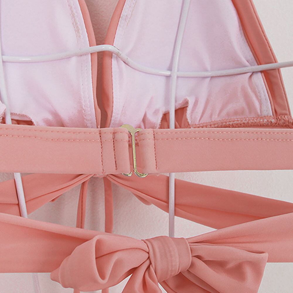 ベビーピンクのタッセルリボンのついているホルターネックのビキニです。