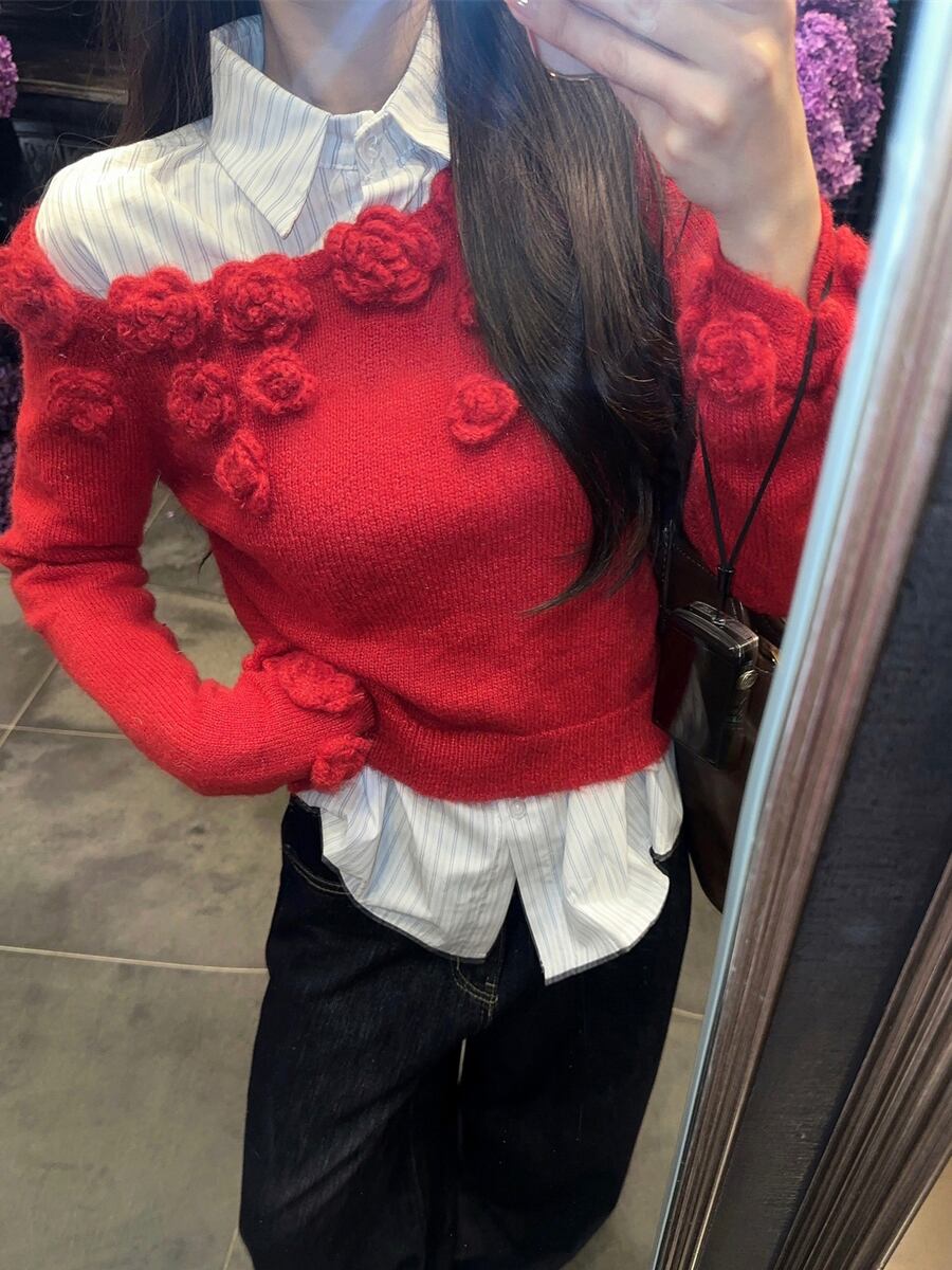 お花のモチーフがいっぱいついたワンショル長袖ニットです。