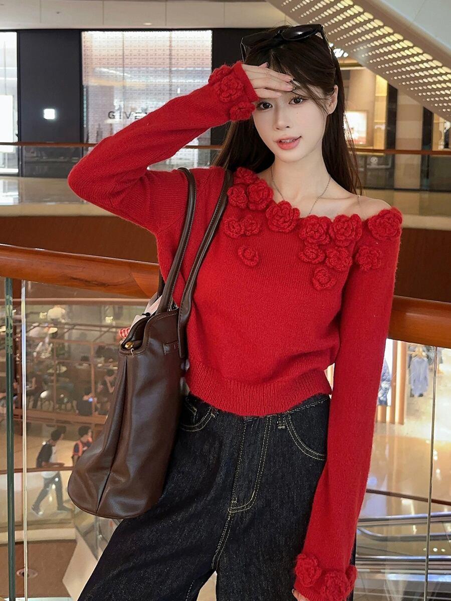 ワンショルお花モチーフニット トップス 長袖 袖口飾り お花モチーフ かぎ針編み クロシェ編み ワンショルダー ワンショル 秋冬 あたたか お花 フワラーモチーフ 袖長め ガーリー 大人可愛い きれいめ きちんと感 シンプル カジュアル 大人 おしゃれ お洒落 大人女子 ラブリー キュート 無地 レディース OL 通勤 学生 通学 デート お出かけ 韓国 韓国系 オルチャン ファッション コーデ スタイル モテ サイズ 韓国コーデ 韓国ファッション 白 ホワイト ブラック 黒