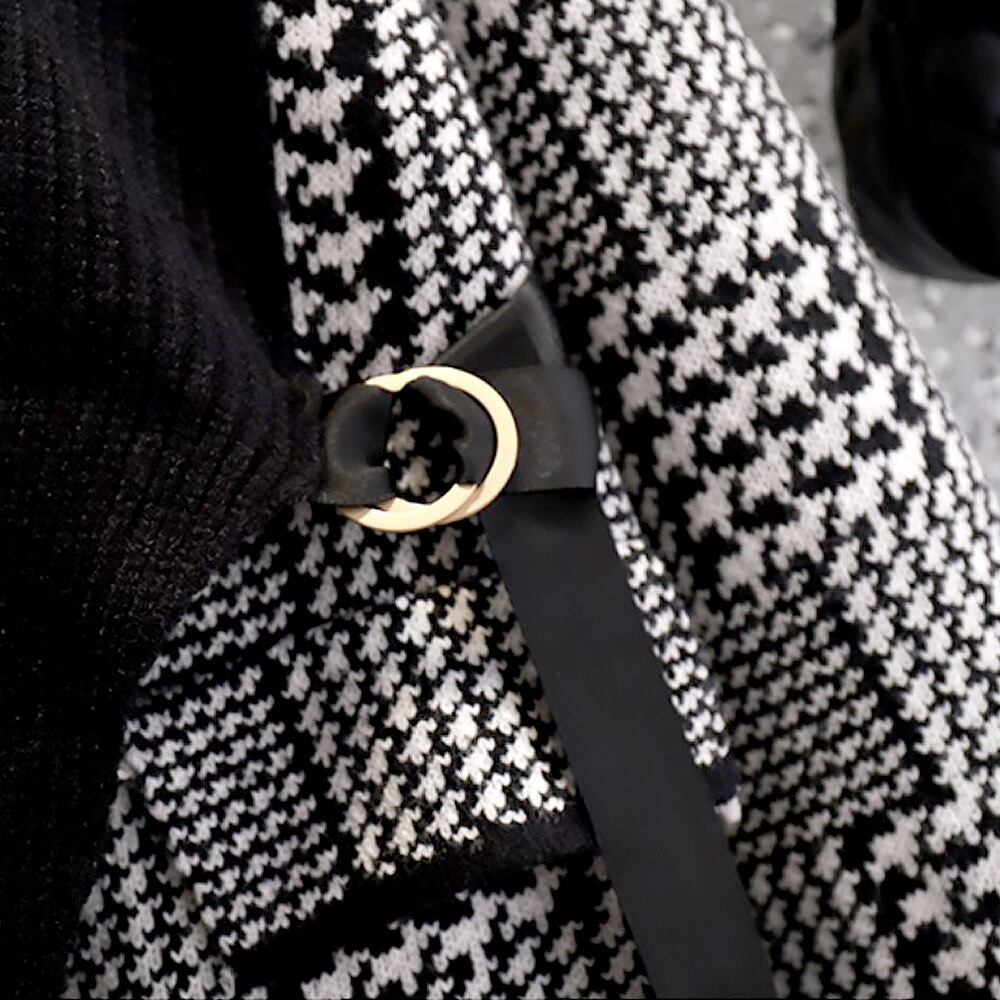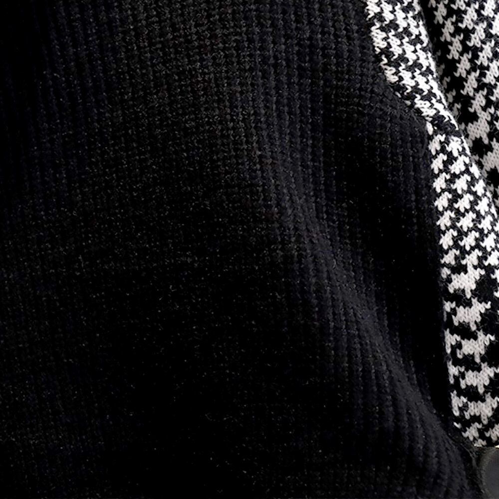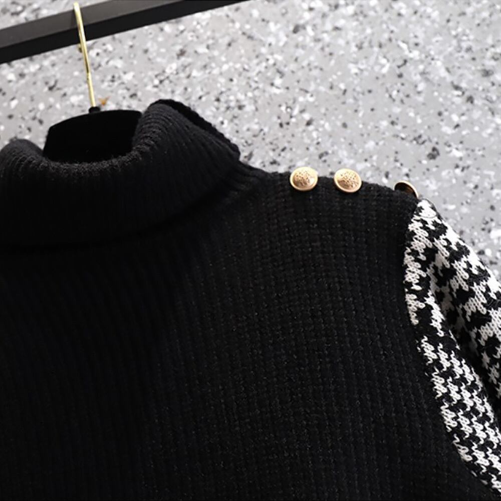ハイネック千鳥格子切り替えセーター 長袖 金ボタン ゴールドボタン アシンメトリー リングベルト 片側千鳥格子柄 ハウンドトゥース 黒白 ニット セーター 袖あり ハイネック ドッキング 伸縮性 かわいい 大人可愛い カジュアル 大人 おしゃれ 大人女子 こなれ感 キュート セクシー 主役級 存在感 無地 格子柄 秋 冬 レディース 学生 通学 デート お出かけ 日 着回し 普段使い オルチャン フリーサイズ 大人カラー モノトーン 韓国コーデ 韓国ファッション