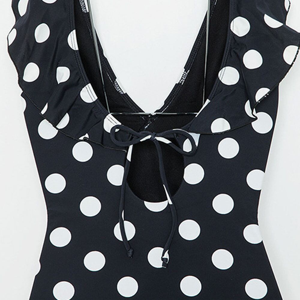 水着 水玉Vカットフレアワンピース ワンピース水着 背中リボン バックリボン 背中カットアウトワンピース モノキニ 白黒 モノクロ ドット柄 ワンピース スイム 胸フリル ギャザー 胸元フリル フリル スイムウェア パッド付き しっかりホールド オールインワン 体型カバー フェミニン ガーリー インスタ映え おしゃれ お洒落 レディース 女性用 ホテル 温泉 海 リゾート 旅行 スタイルアップ 韓国 M L XL 韓国コーデ 韓国ファッション
