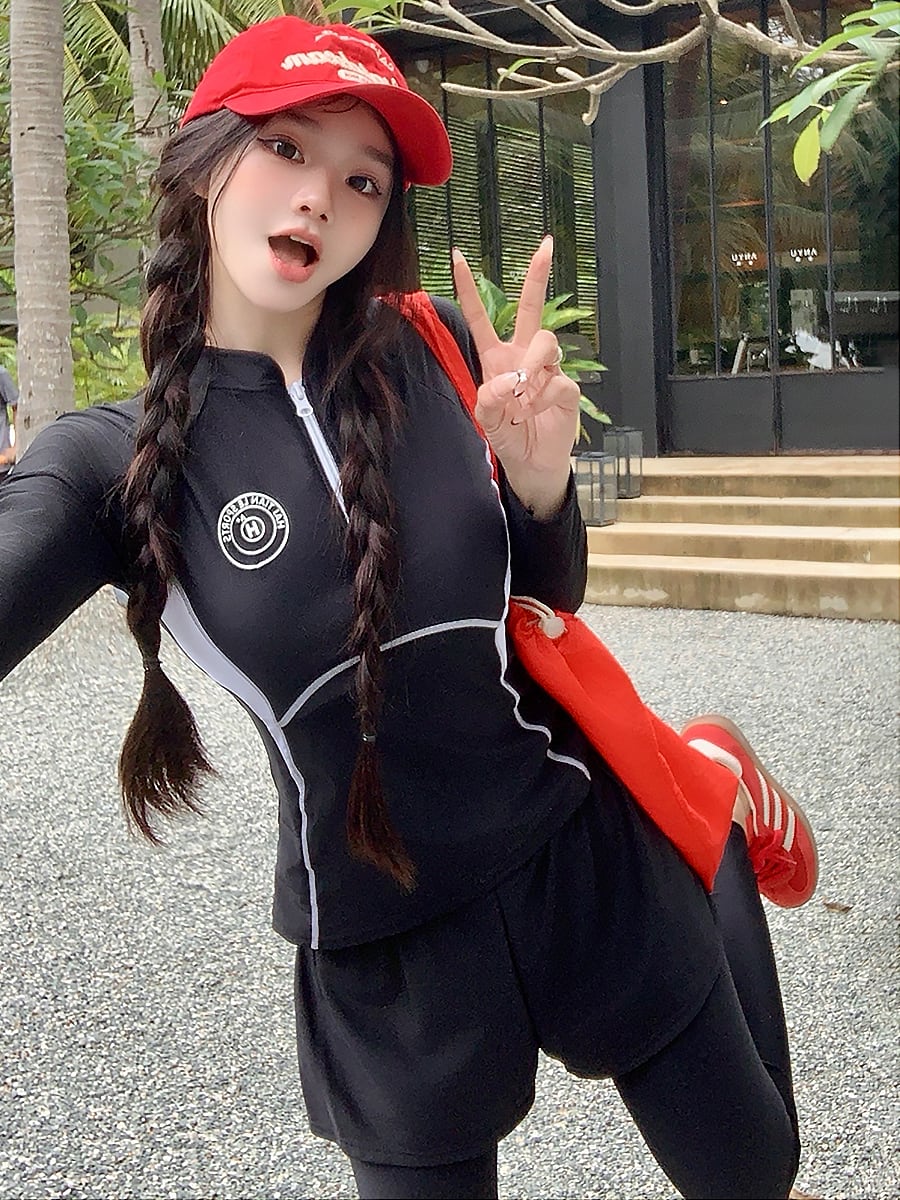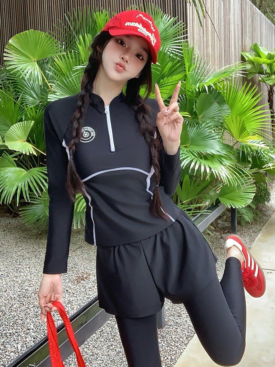 ハーフジップの長袖トップスとショートパンツがドッキングされたロングパンツのツーピース水着です。