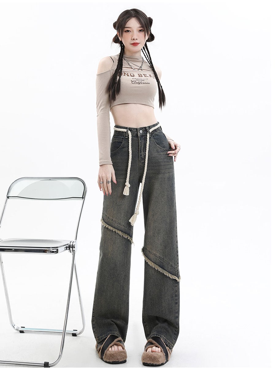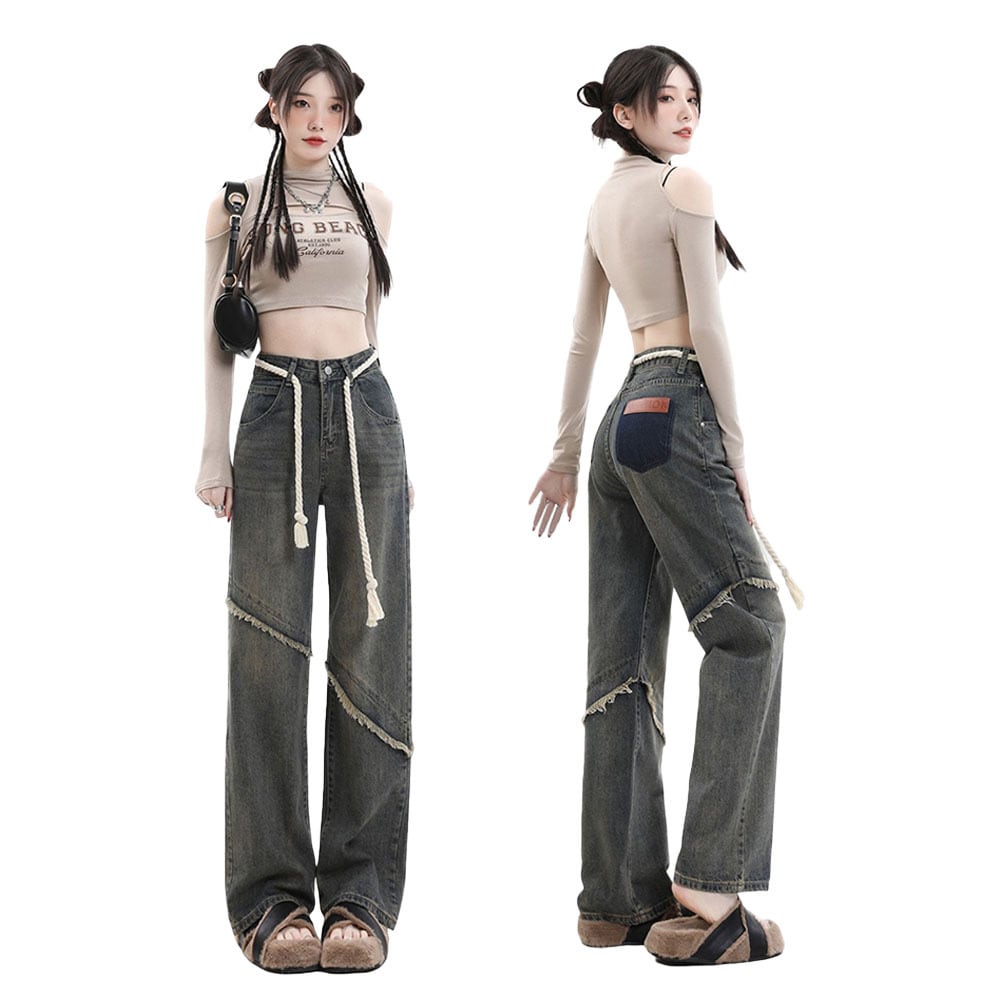 長さが選べる 斜めフリンジデニムパンツ ロープベルト付き ウォッシュ加工 ヴィンテージ風 デニムパンツ ジーンズ ロングジーンズ ボトムス パンツ Gパン ワイドパンツ ワイド ポケット ハイウエスト ブルーデニム フリンジ シンプル カジュアル おしゃれ かっこいい こなれ感 メンズライク 抜け感 無地 春 夏 秋 冬 シーズンレス レディース ママ 女の子 学生 通学 デート お出かけ 公園デビュー 着回し 普段使い 韓国系 オルチャン 脚長 定番 青 ブルー 韓国コーデ 韓国ファッション