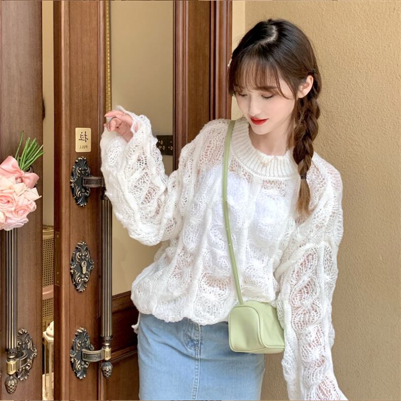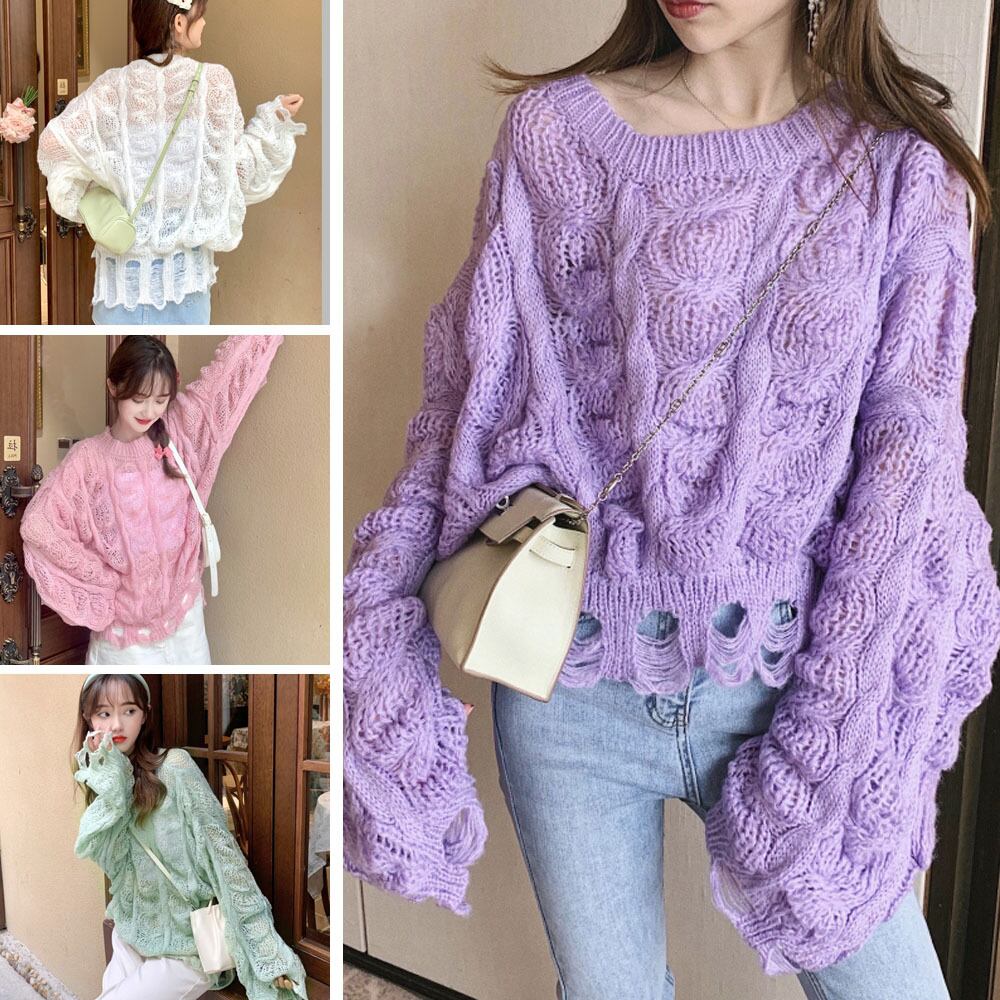 全4色 シースルーニットセーター 透け感セーター ニット モヘヤ風 モヘヤタッチ ケーブル編み ダメージニット ゆったり オーバーサイド トップス プルオーバー 袖あり 長袖 萌袖 Uネック ラウンドネック 襟なし ふんわり かわいい 大人可愛い きれいめ カジュアル 大人 上品 大人女子 こなれ感 ラフ ルーズ 無地 春 秋 冬 レディース 学生 楽ちん 暖かい ワンサイズ ピンク ホワイト ブルー パープル 韓国コーデ 韓国ファッション