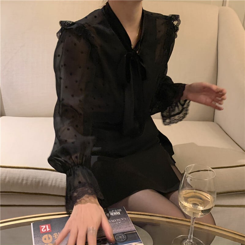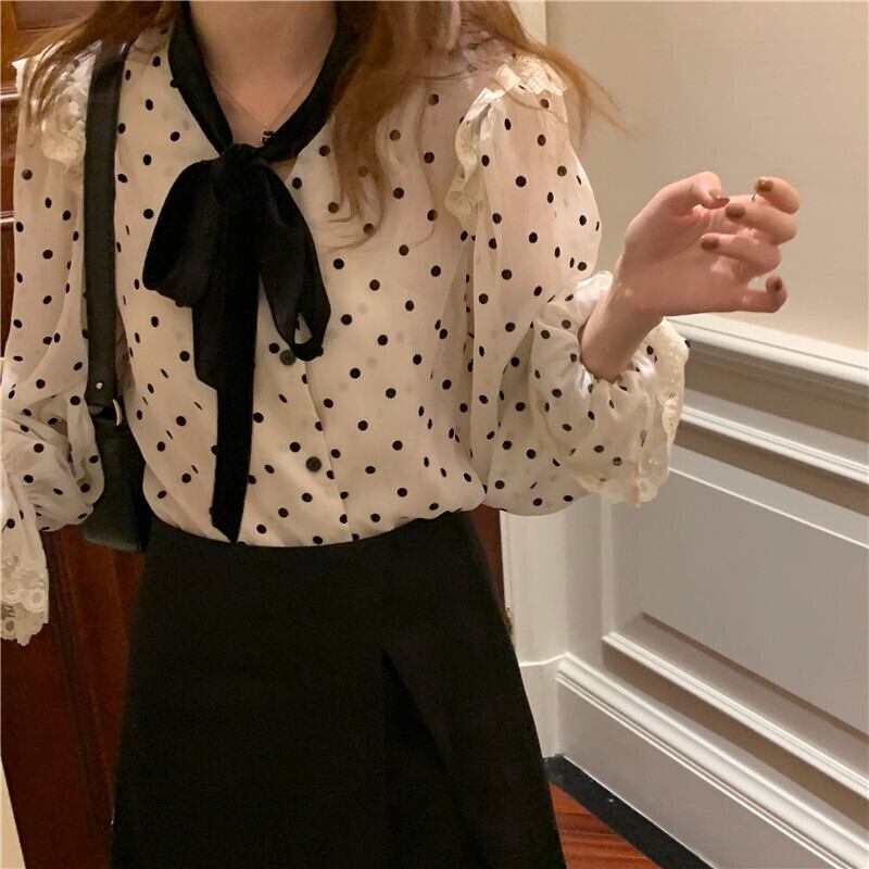 全2色 ドット柄シフォン長袖ブラウス ドット柄 水玉 袖口フリル 肩フリル 長袖 ボリューム袖 パフスリーブ フレアスリーブ ホルンスリーブ リボン ボウタイ シフォン 前開き 透け感 シースルー かわいい 大人可愛い きれいめ シンプル 上品 お嬢様 おしゃれ お洒落 レトロ 大人女子 ラブリー キュート ガーリー 個性的 モード系 エレガント モダン 主役級 存在感 抜け感 お出かけ 着回し 韓国コーデ 韓国ファッション 黒 白