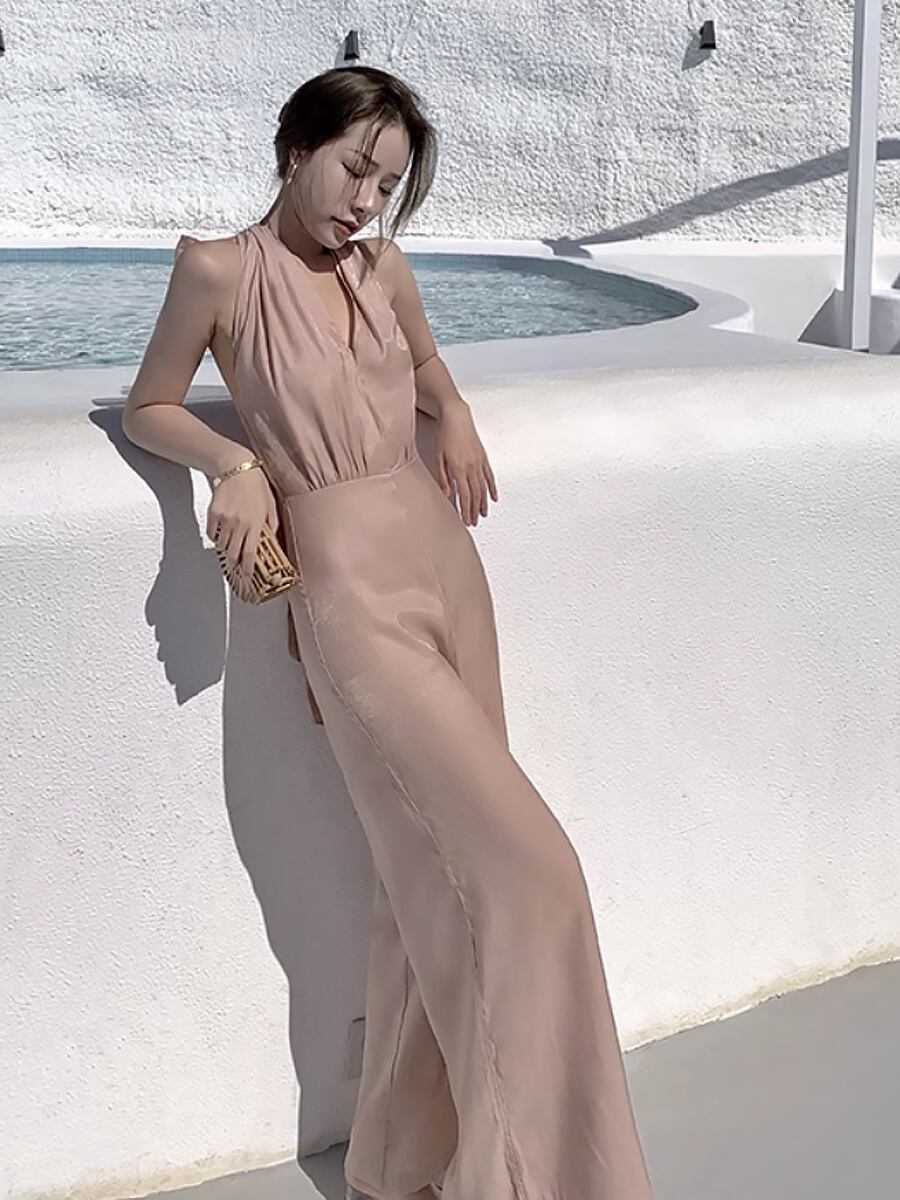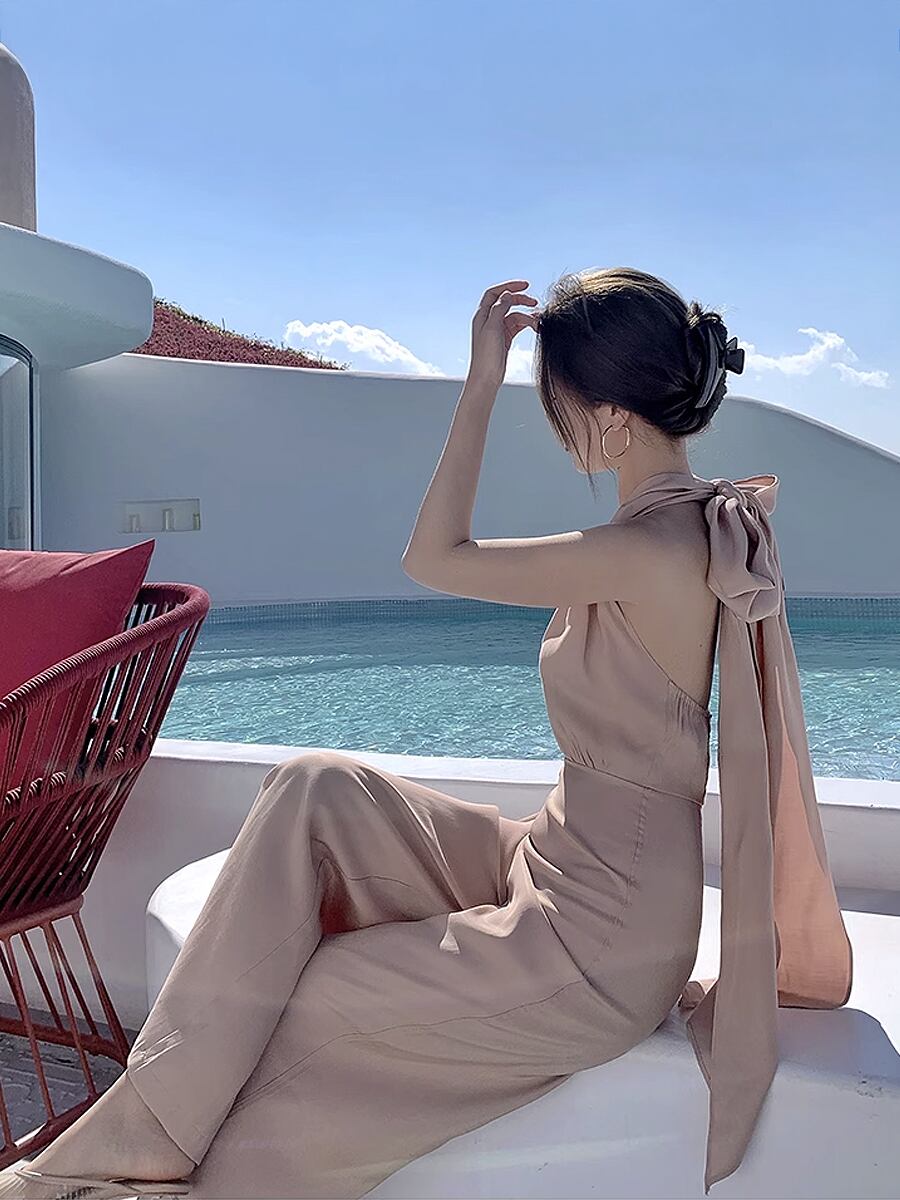 バックリボンオールインワン コンビネゾン サロペット ビッグリボン パンツドレス ワイドパンツ つなぎ ロング丈 袖なし パーティパンツ パンツスタイル かわいい フレアパンツ スリット 大人可愛い きれいめ エレガント 結婚式 謝恩会 大人 上品 おしゃれ お洒落 かっこいい 大人女子 こなれ感 ラフ キュート クール モード系 ノースリーブ 抜け感 レディース デート お出かけ モテ 美脚 脚長 ベージュ 韓国コーデ 韓国ファッション