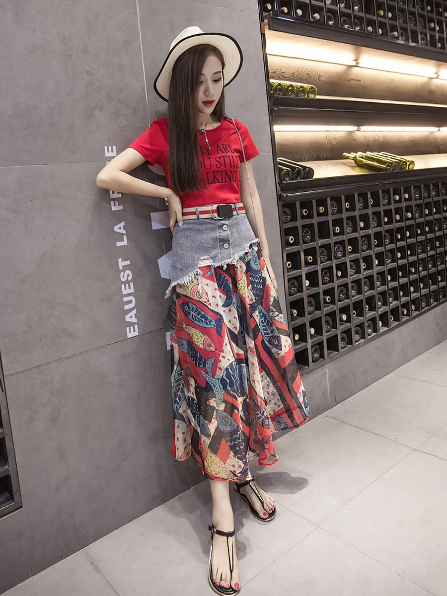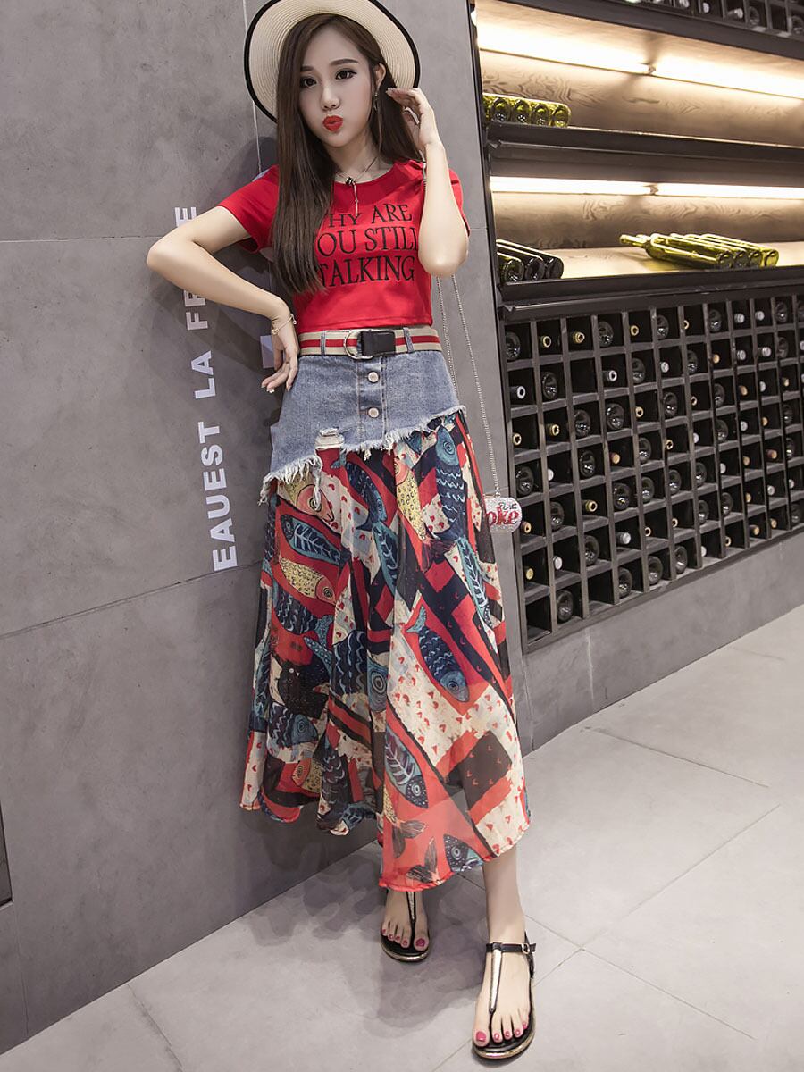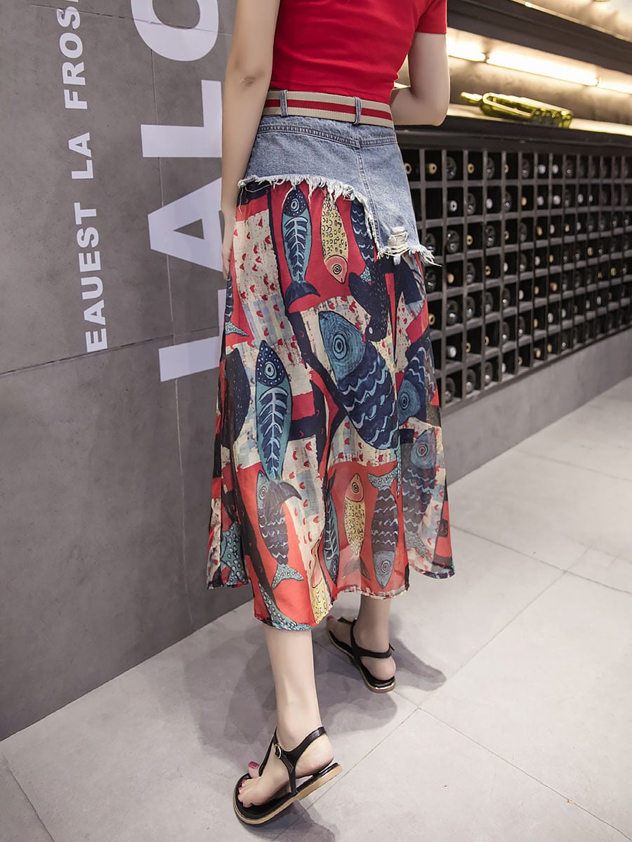 デニムスカートと派手やかな柄スカートがドッキングしたおしゃれなスカートです。
