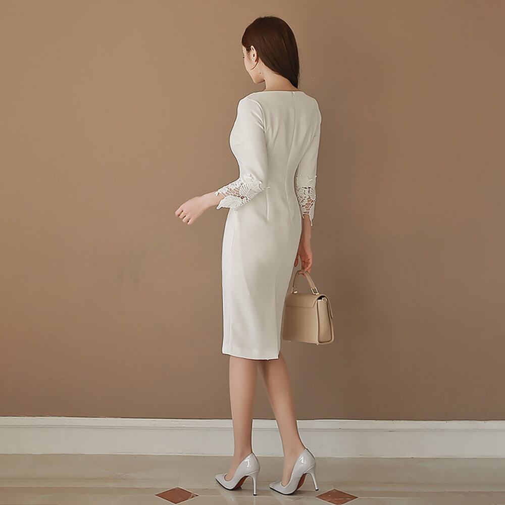 袖のレースがエレガントな印象のフォーマルワンピースです。