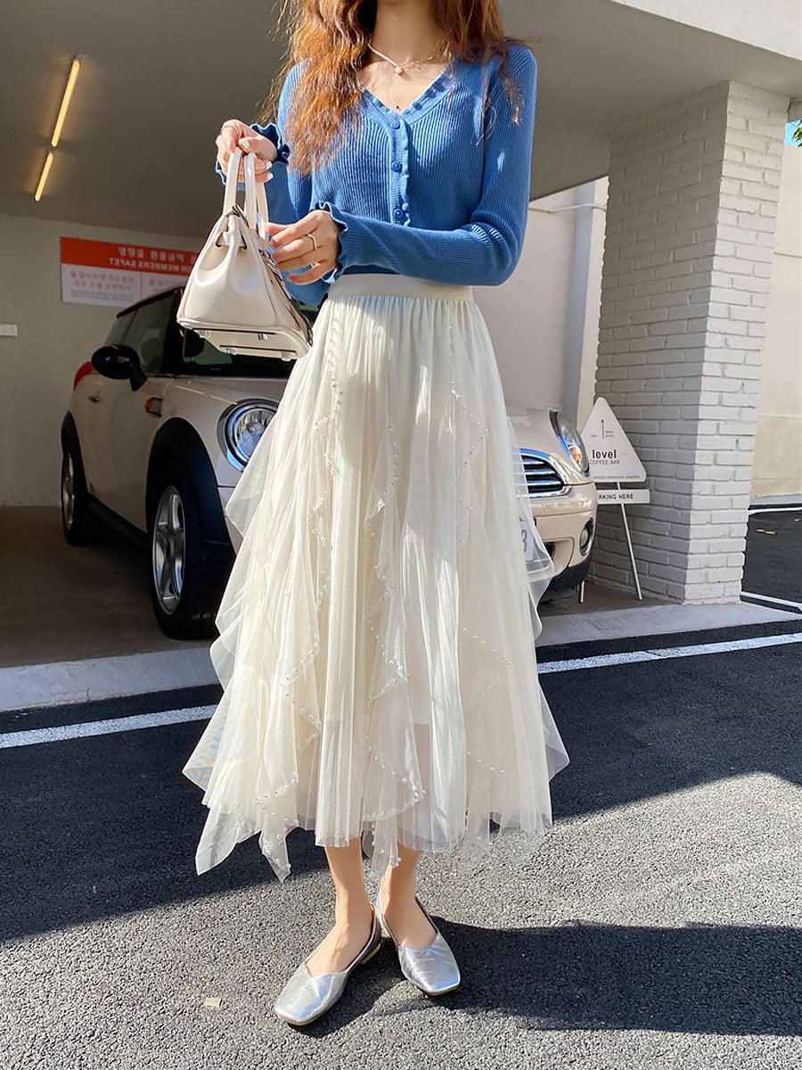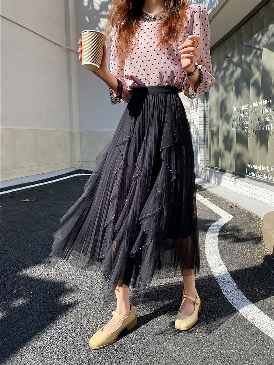 全2色 チュールレースビーズフレアスカート ロングスカート フレアスカート チュールスカート フリル ロング ビーズ パールビーズ ふんわり 揺れる フレア ワイド Aライン アシンメトリー レース チュール シフォン ウエストゴム 透け感 シースルー 薄手 かわいい 大人可愛い きれいめ シンプル 上品 おしゃれ かっこいい レトロ 大人女子 こなれ感 ラブリー キュート ガーリー モード系 エレガント モダン 無地 オールシーズン フリーサイズ 韓国コーデ 韓国ファッション