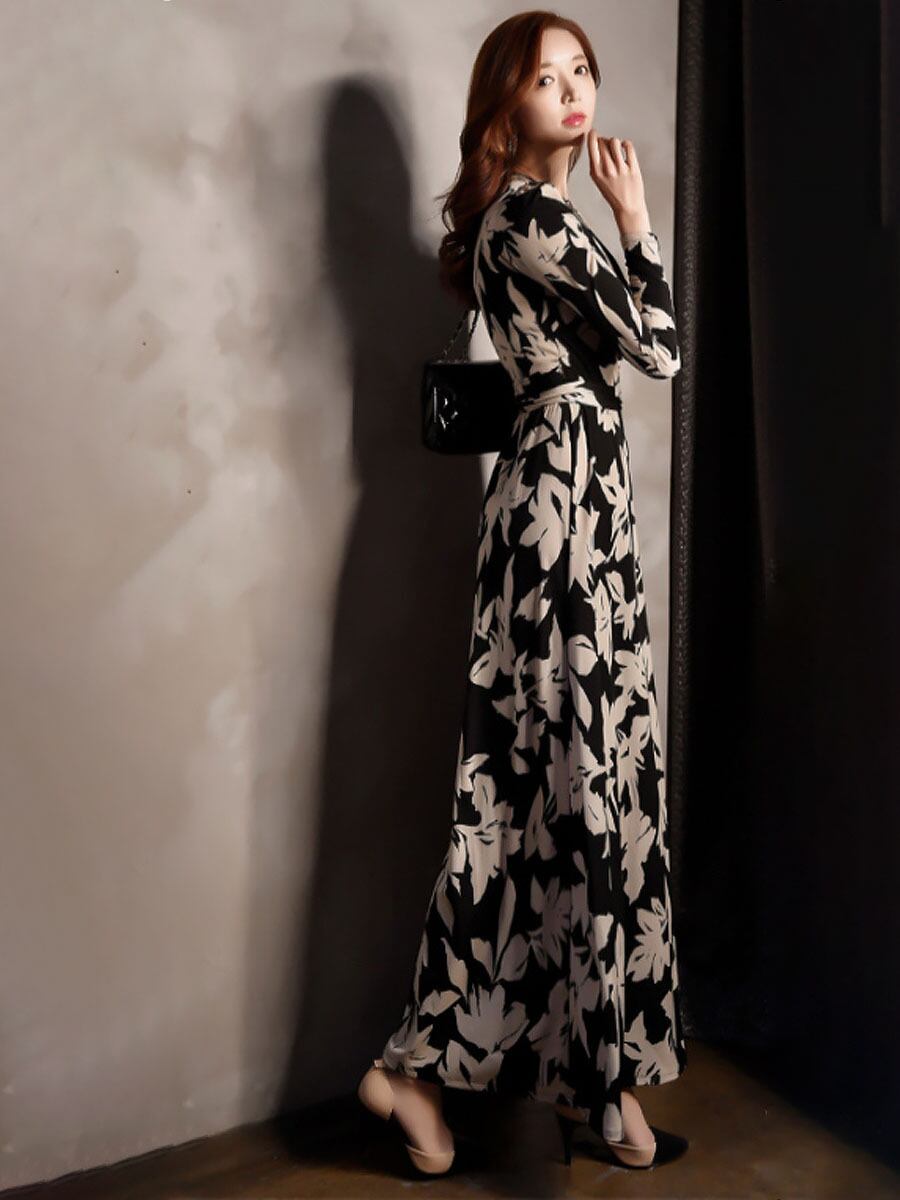 全2色 カシュクール花柄リボンワンピース フレアワンピース ワンピドレス ミモレ ロング フラワープリント 長袖 フレアスリーブ フレンチスリーブ Vネック 襟なし セミフレア スリム タイト 細身 ストレート スマート ウエストマーク スリット 大人可愛い きれいめ シンプル カジュアル 上品 おしゃれ お洒落 かっこいい レトロ 大人女子 こなれ感 個性的 モード系 エレガント モダン 主役級 存在感 抜け感 柄 花柄 韓国コーデ 韓国ファッション 黒 紺 濃紺