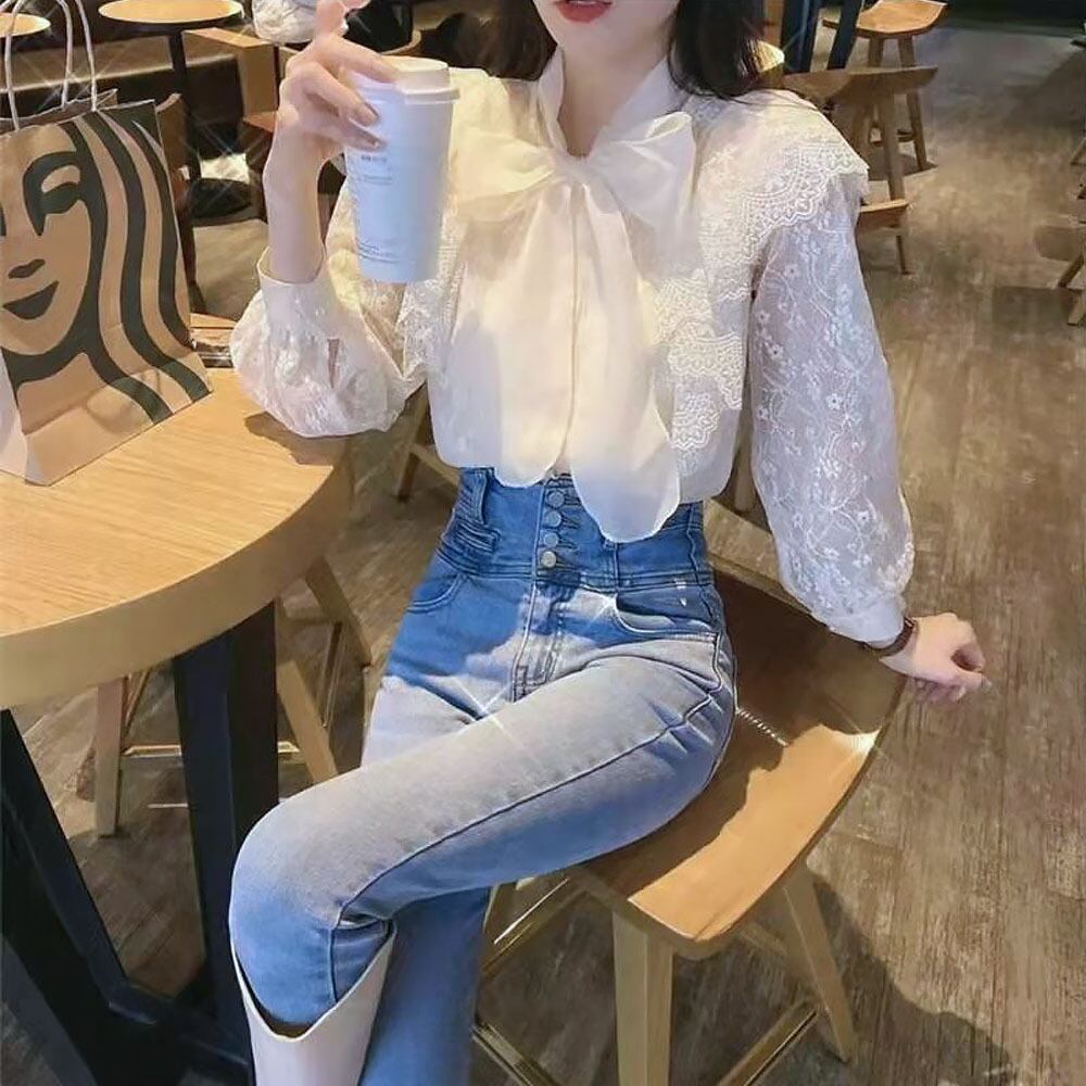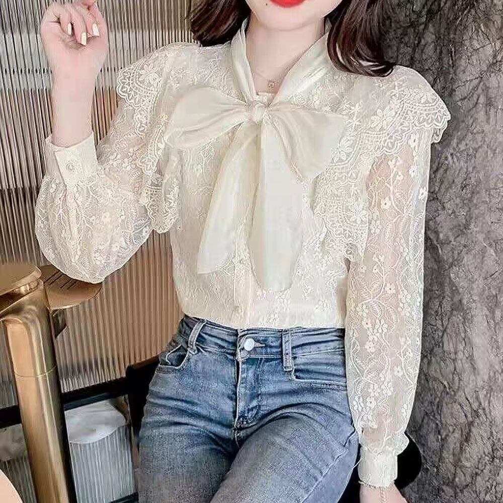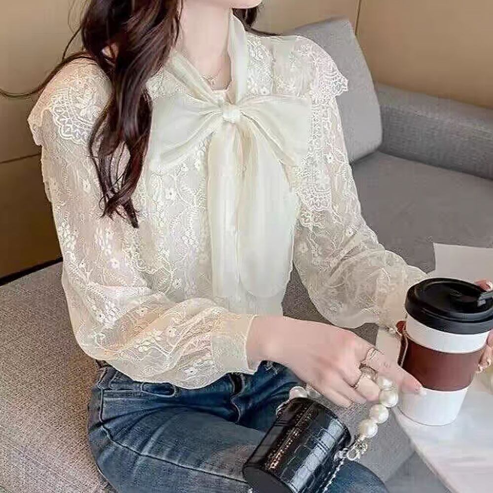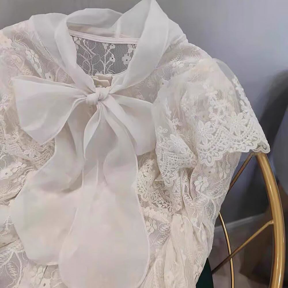 総レースリボンタイブラウス レース フリル シルバーボタン 前開きトップス シャツブラウス 白シャツ 白トップス 白ブラウス レースブラウス ミディアム丈 長袖 ボリューム袖 パフスリーブ フレアスリーブ フレンチスリーブ 萌袖 フレア 切り替えデザイン チュール フリル リボン 花模様レース 透け感 かわいい 大人可愛い きれいめ シンプル カジュアル 上品 おしゃれ お洒落 かっこいい レトロ 大人女子 こなれ感 ラブリー キュート ガーリー エレガント 韓国コーデ