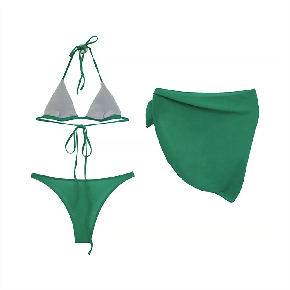 エメラルドグリーンの鮮やかな色で、フロントでクロスしてバックにまわし、さらに前にまわして結ぶタイプのビキニ上下とパレオの3点セットです。