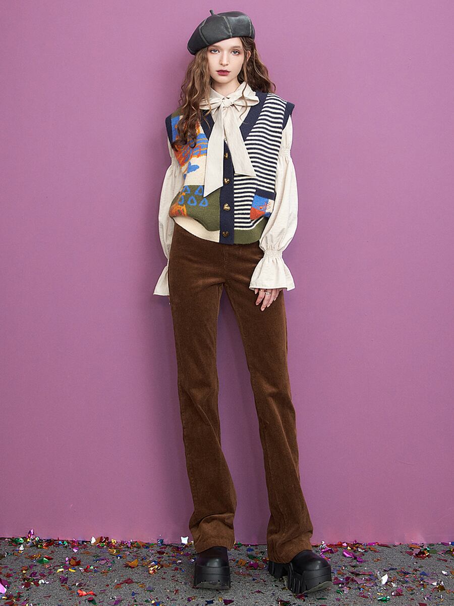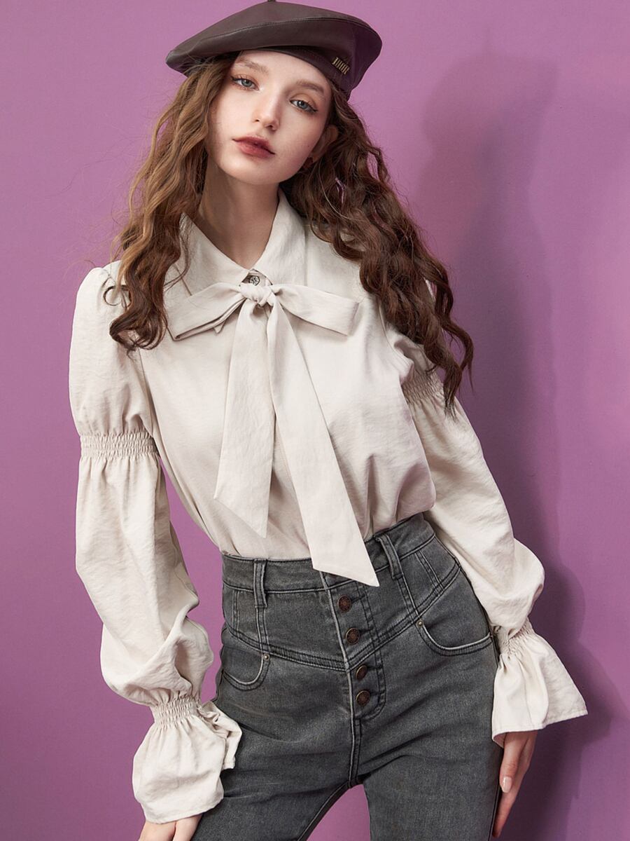 大きめのリボンとシャーリングでふくらませた袖がポイントの秋冬ブラウスです。