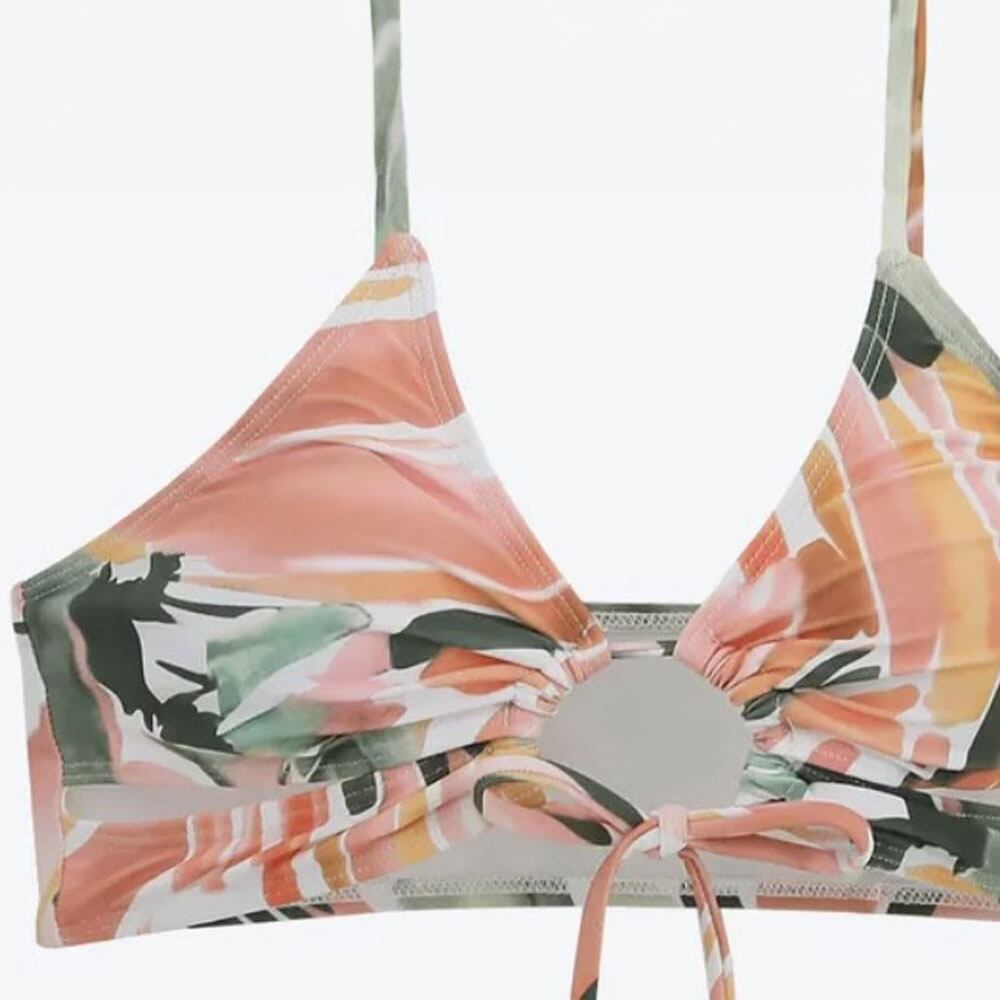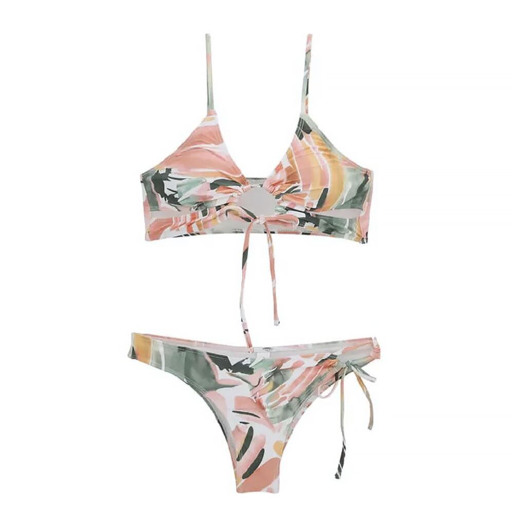 水着 タイアップブラレットビキニ 南国リーフプリント スイムウェア セパレート リーフプリント キーホール 花柄 フラワープリント パッド付き ワイヤーなし 大人っぽい 色っぽい カシュクール風 かわいい 大人可愛い 盛り 寄せ 体型カバー 胸寄せ きれいめ セクシー sexy シンプル 華やか おしゃれ スタイリッシュ モダン エキゾチック 美脚 脚長 バカンス プール 海 韓国コーデ 韓国ファション 胸元リボン