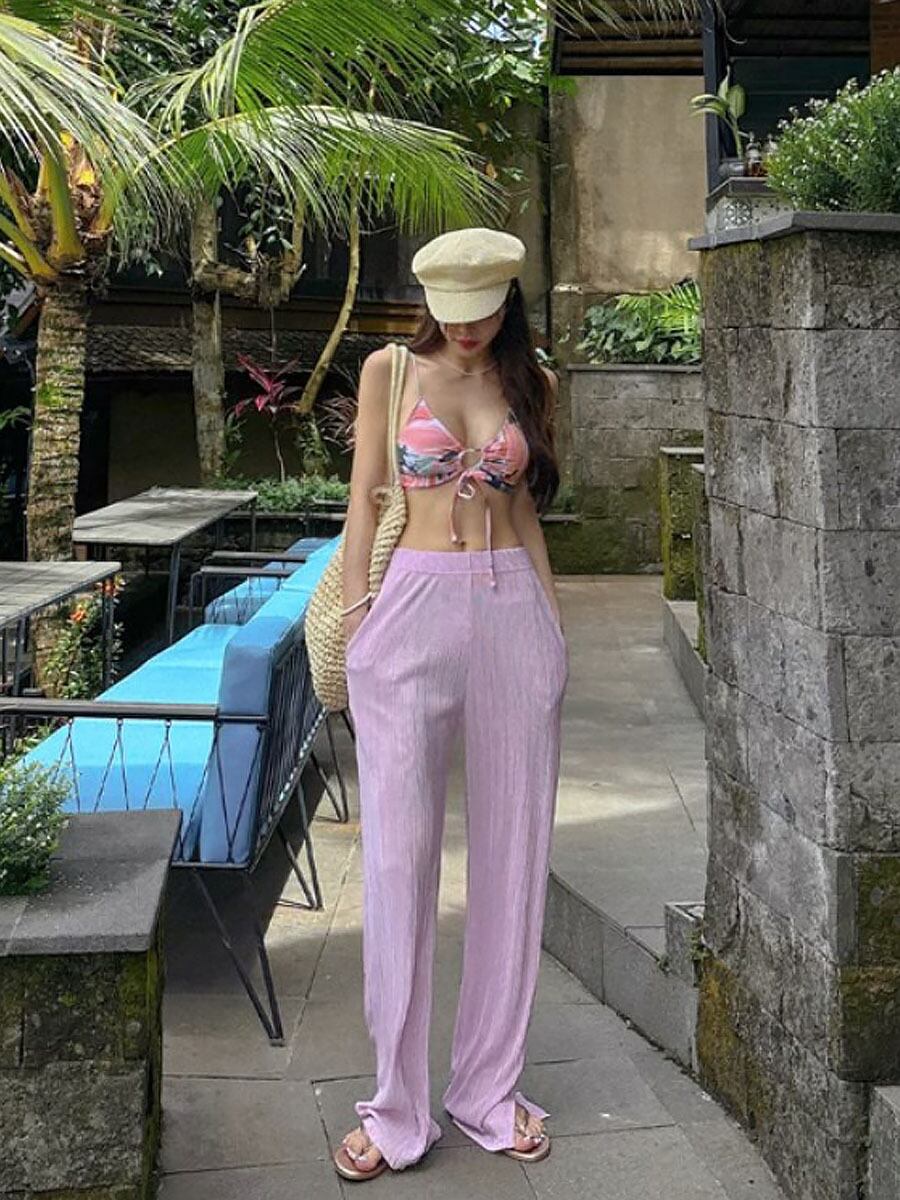 南国調のカラーが肌色をよく見せてくれ、ホテルやビーチによく似合う一着です。