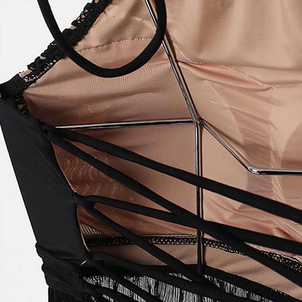 ベージュの上に重ねられた黒のレースが大人っぽくてセクシーなホルターネックビキニです。