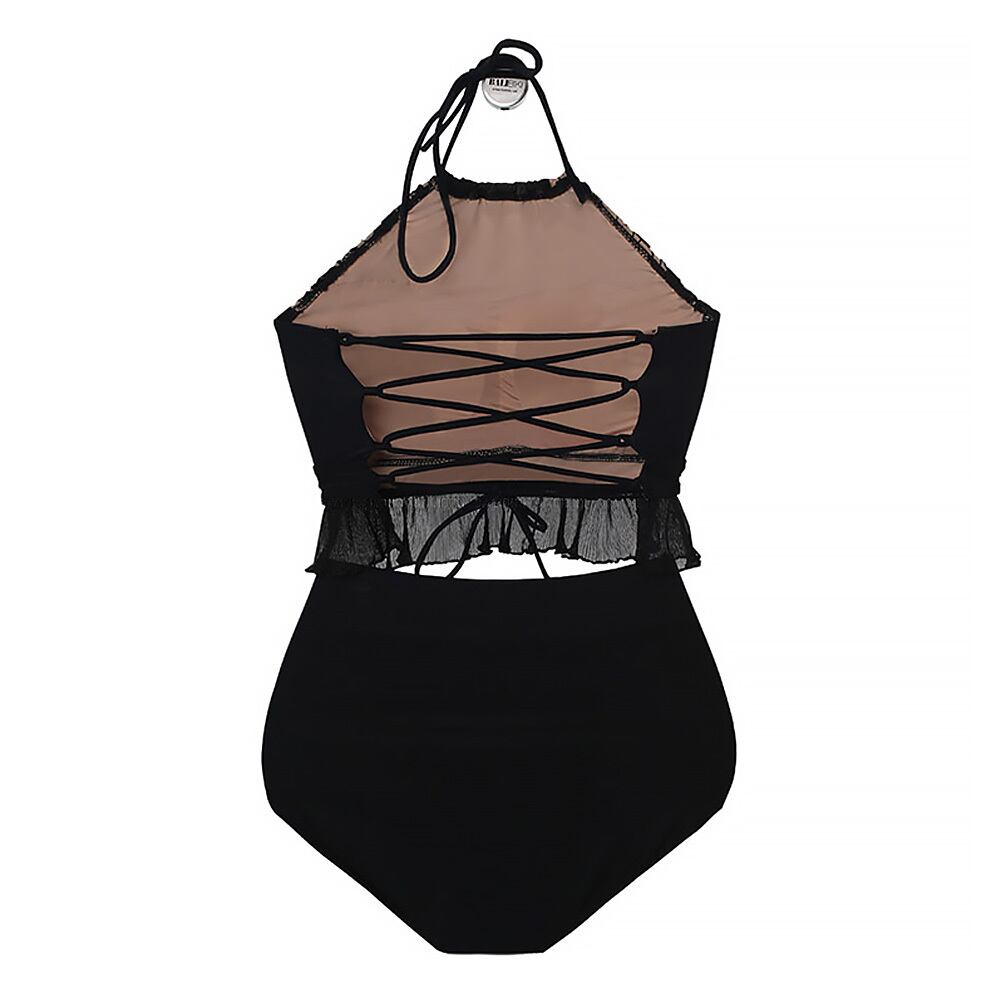水着 ブラックレースホルターネックビキニ タンキニ ハイウエスト ホルターネック フリル フレア レースアップ 編み上げ バックシャン バックコンシャス バックリボン シャーリング スイムウェア 体型カバー パッド付き ワイヤーなし かわいい 大人可愛い きれいめ セクシー 大人 大人っぽい おしゃれ レトロ 主役級 シャーリングデザイン レディース 夏 海 ビーチ プール リゾート 美脚 脚長 モテ 韓国コーデ 韓国ファッション 黒